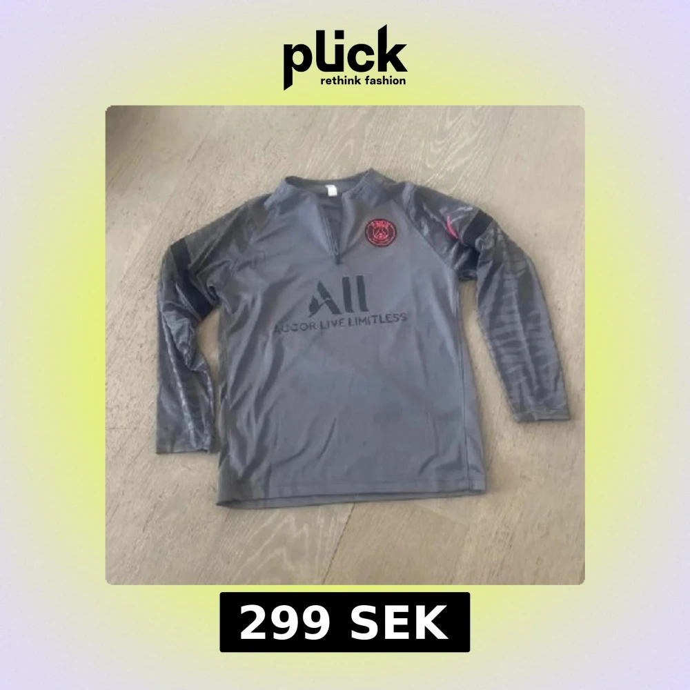 Snygg grå långärmad fotbollströja från Nike för Paris Saint-Germain med svart tryck och röd PSG-logga på bröstet. Tröjan har halv dragkedja framtill och är gjord i ett lätt, sportigt material som andas. Perfekt för träning eller när du vill representera ditt lag. lite trådar se bild 3 men inget som syns. Tryck ej köp nu
