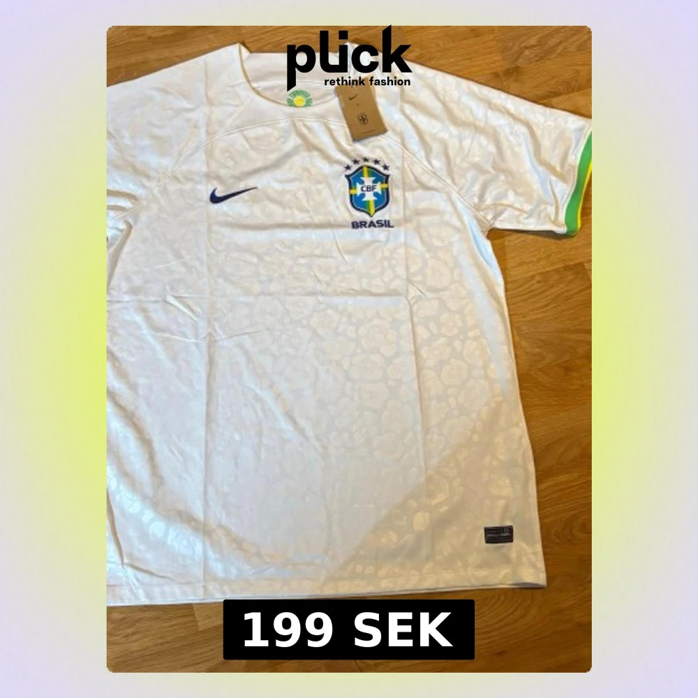 Säljer en vit Brasil t-shirt från Nike med diskret leopardmönster i tyget och blå Nike-logga på bröstet. T-shirten har korta ärmar med gröna och gula detaljer vid ärmsluten samt Brasil-märke på bröstet. Perfekt för dig som älskar fotboll och vill sticka ut.