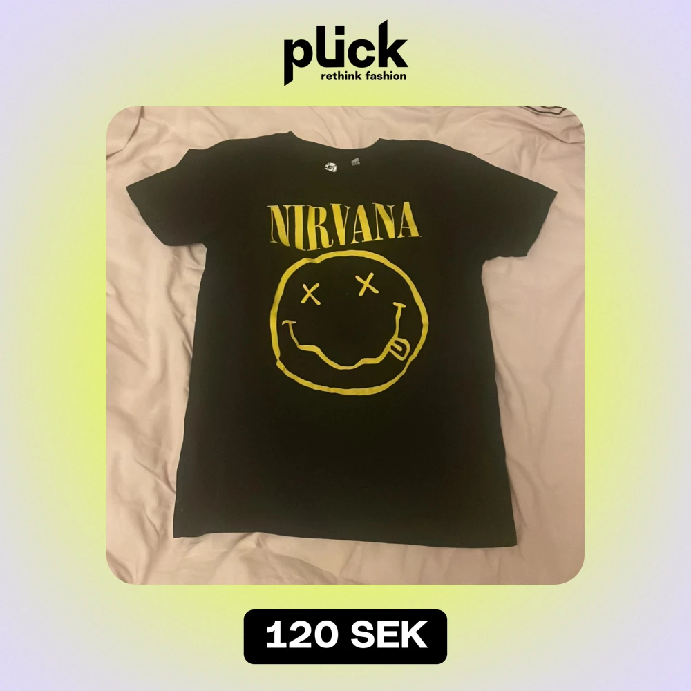 Säljer en svart t-shirt med det ikoniska Nirvana-smileyt i gult på framsidan. Perfekt för alla Nirvana-fans! T-shirten är kortärmad och i bra skick. Den är i storlek 140