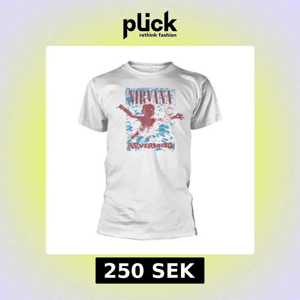 Vit t-shirt med ikoniskt Nirvana Nevermind-tryck på bröstet. Motivet har röd och blå grafik med texten 'Nirvana' och 'Nevermind' samt den klassiska bilden från albumomslaget. Perfekt för dig som älskar grunge och vill ha en snygg bandtröja.