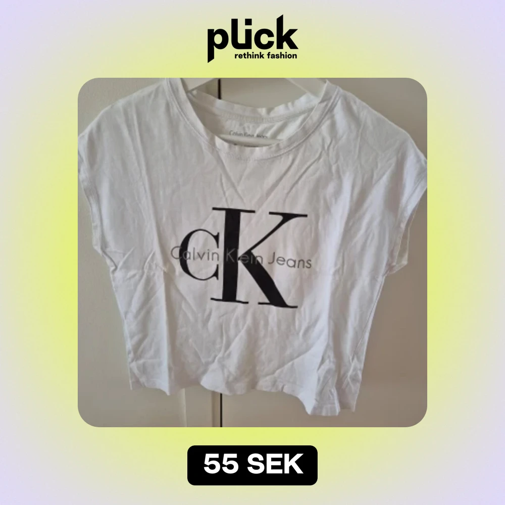 Vit T-shirt med svart/grå tryck från Calvin Klein. Lös modell. Storlek S. 100% bomull. Det är 3 st små stygn vid magen pga små hål.