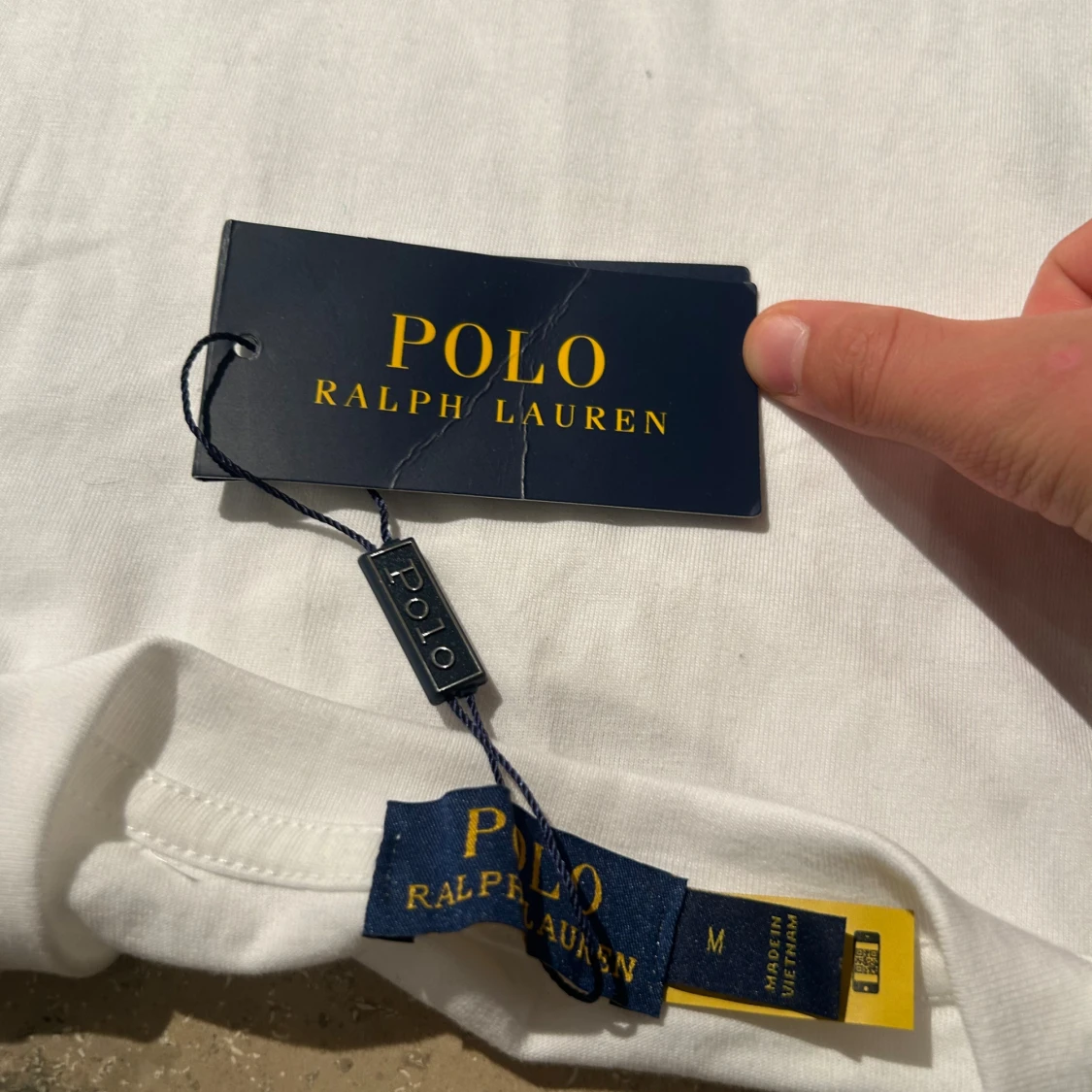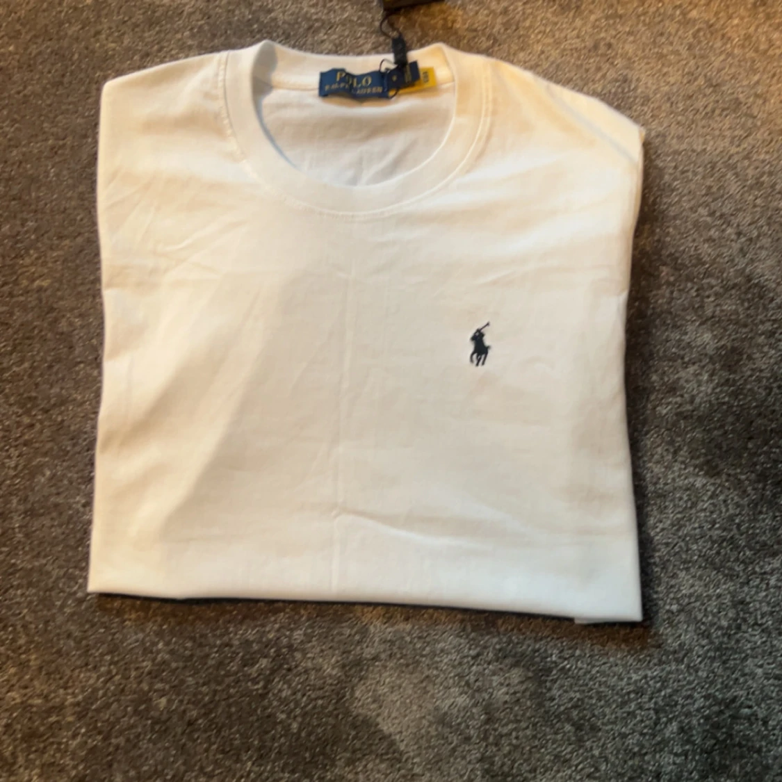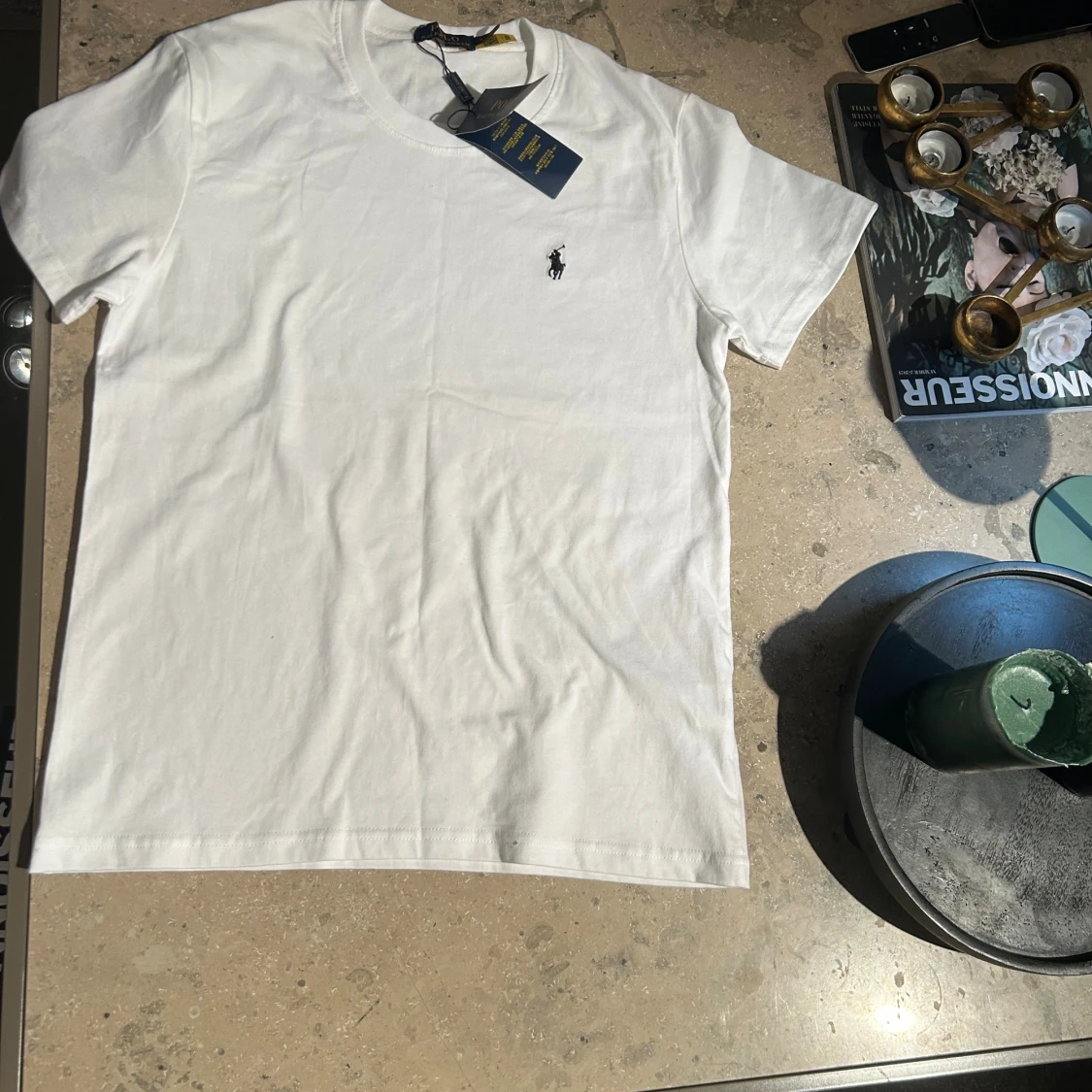 ny med prislapp/tag.Klassisk vit t-shirt från Polo Ralph Lauren med broderad svart logga på bröstet. T-shirten har rund halsringning och korta ärmar. Tillverkad i mjuk bomull för en skön känsla och clean look.