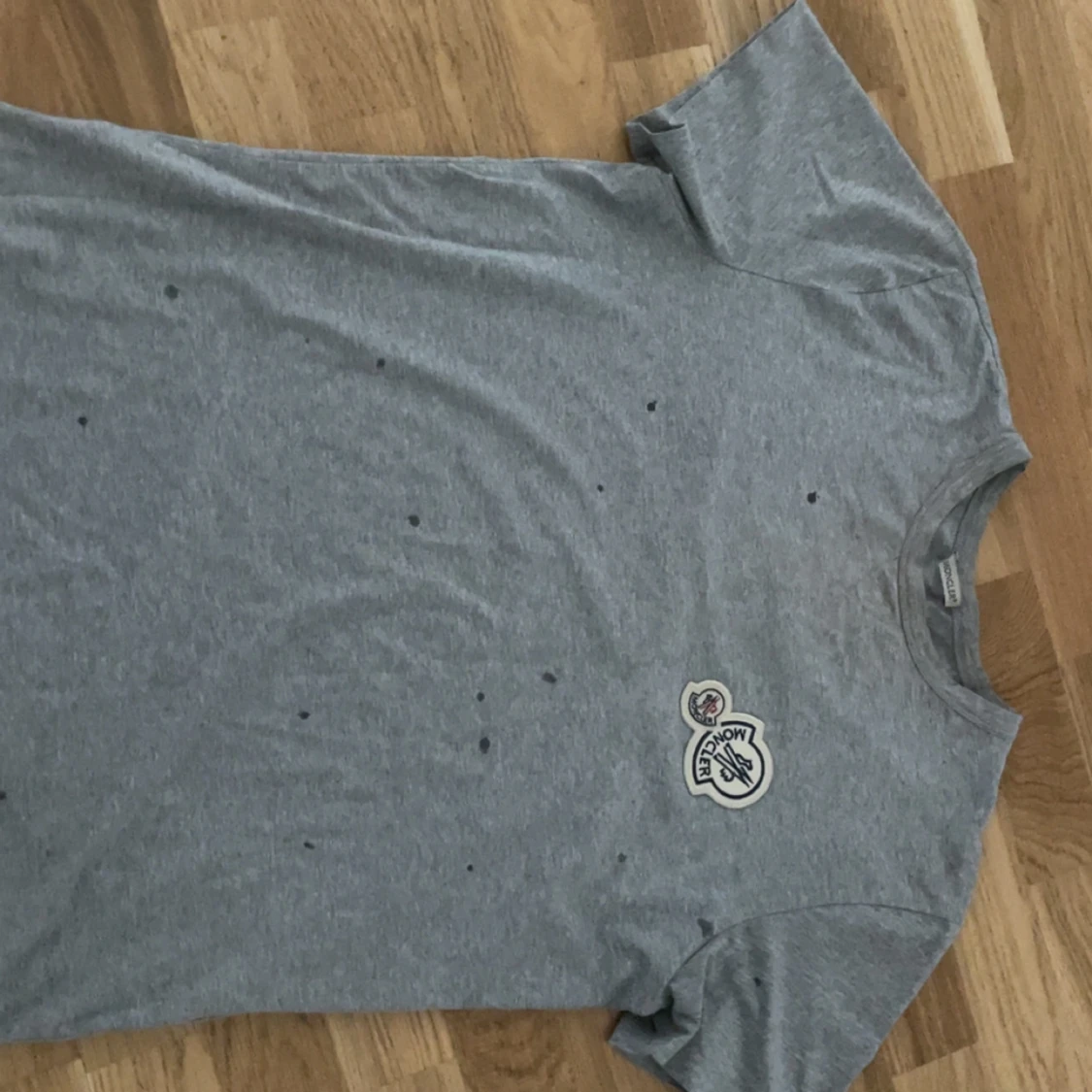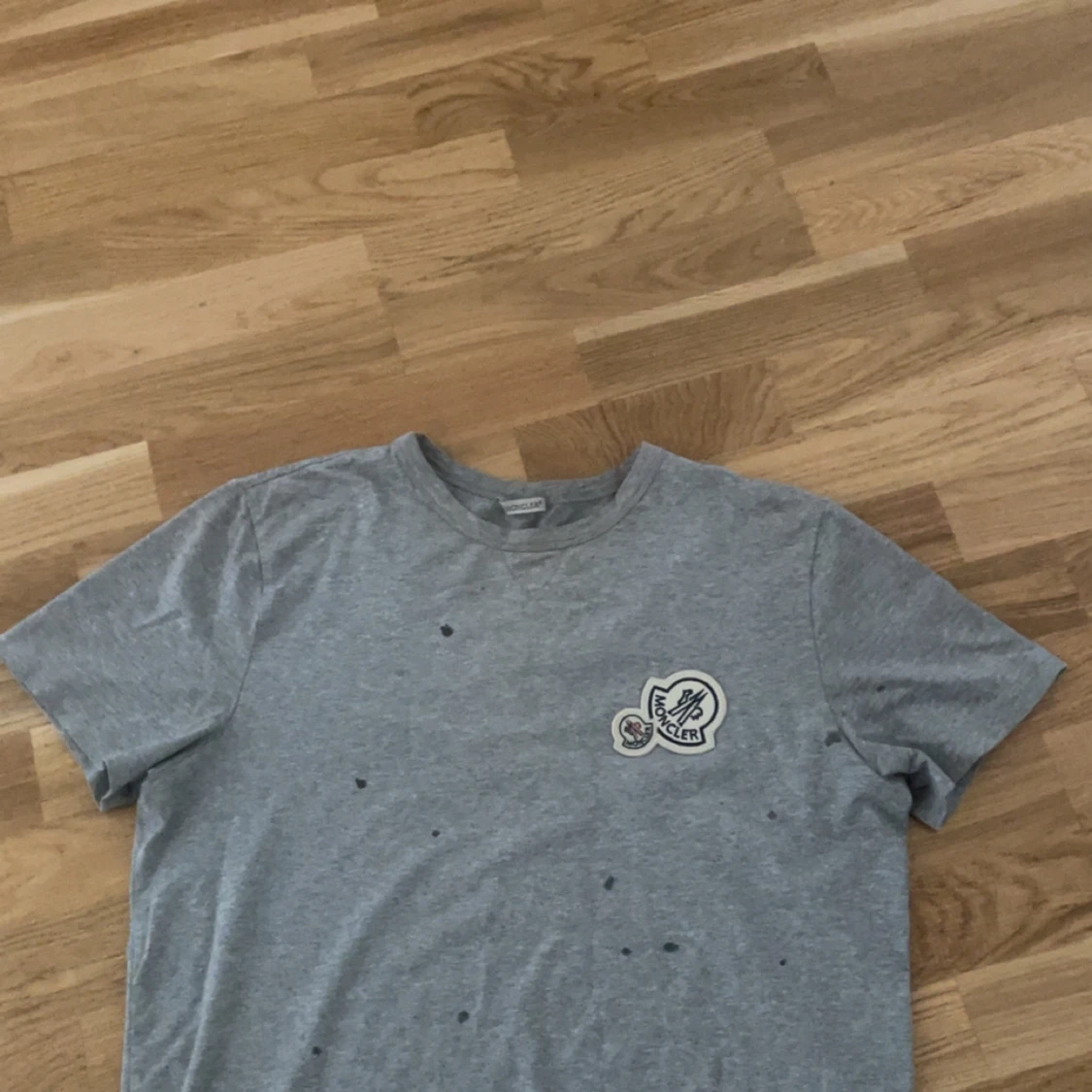 Snygg grå t-shirt från Moncler med rund hals. På bröstet sitter en stor broderad Moncler-patch i vitt, svart och rött. T-shirten är i mjuk bomull och har en clean look. Prickarna är vatten droppar mitt hår är blött. Priset kan diskuteras