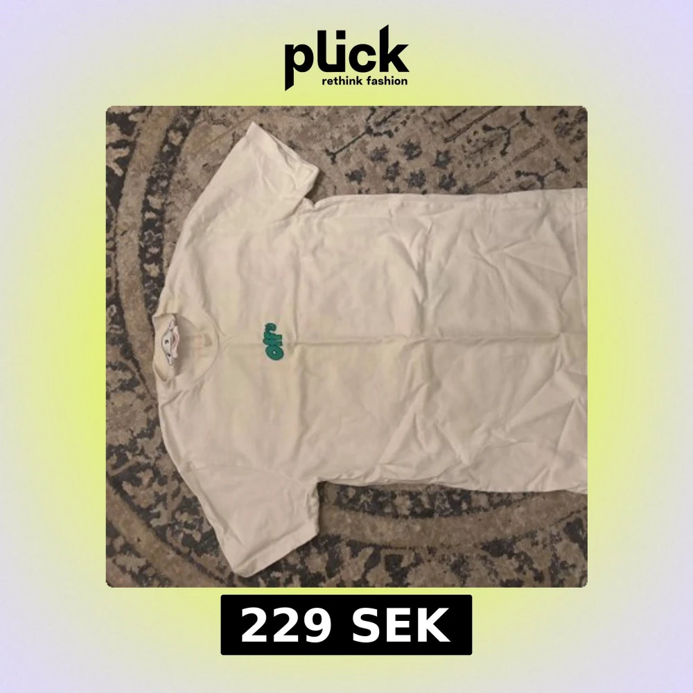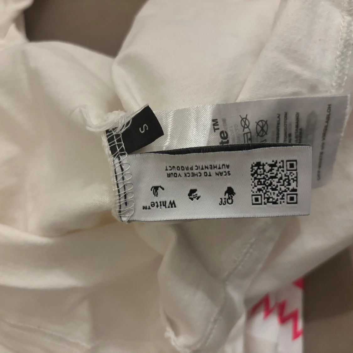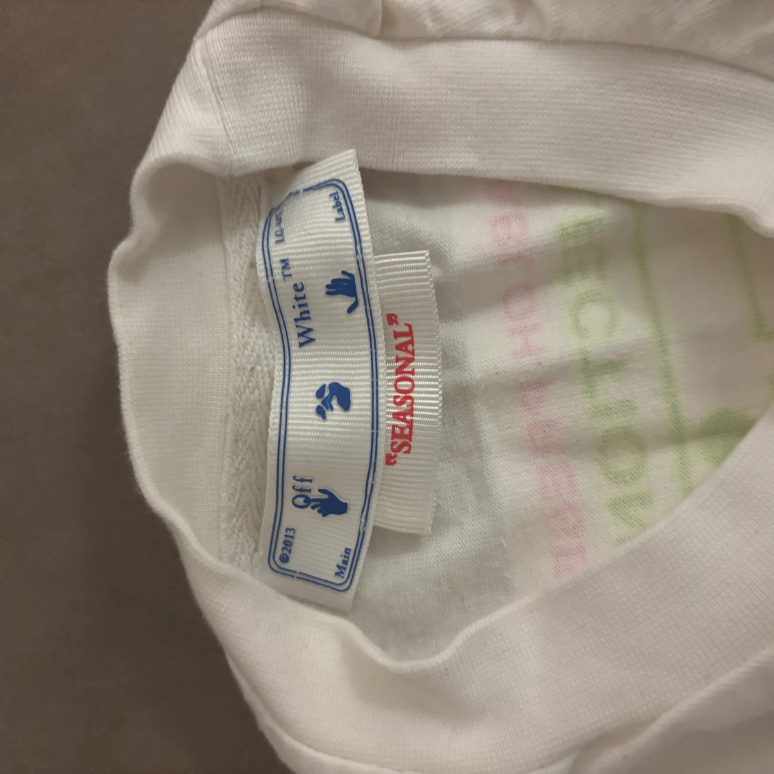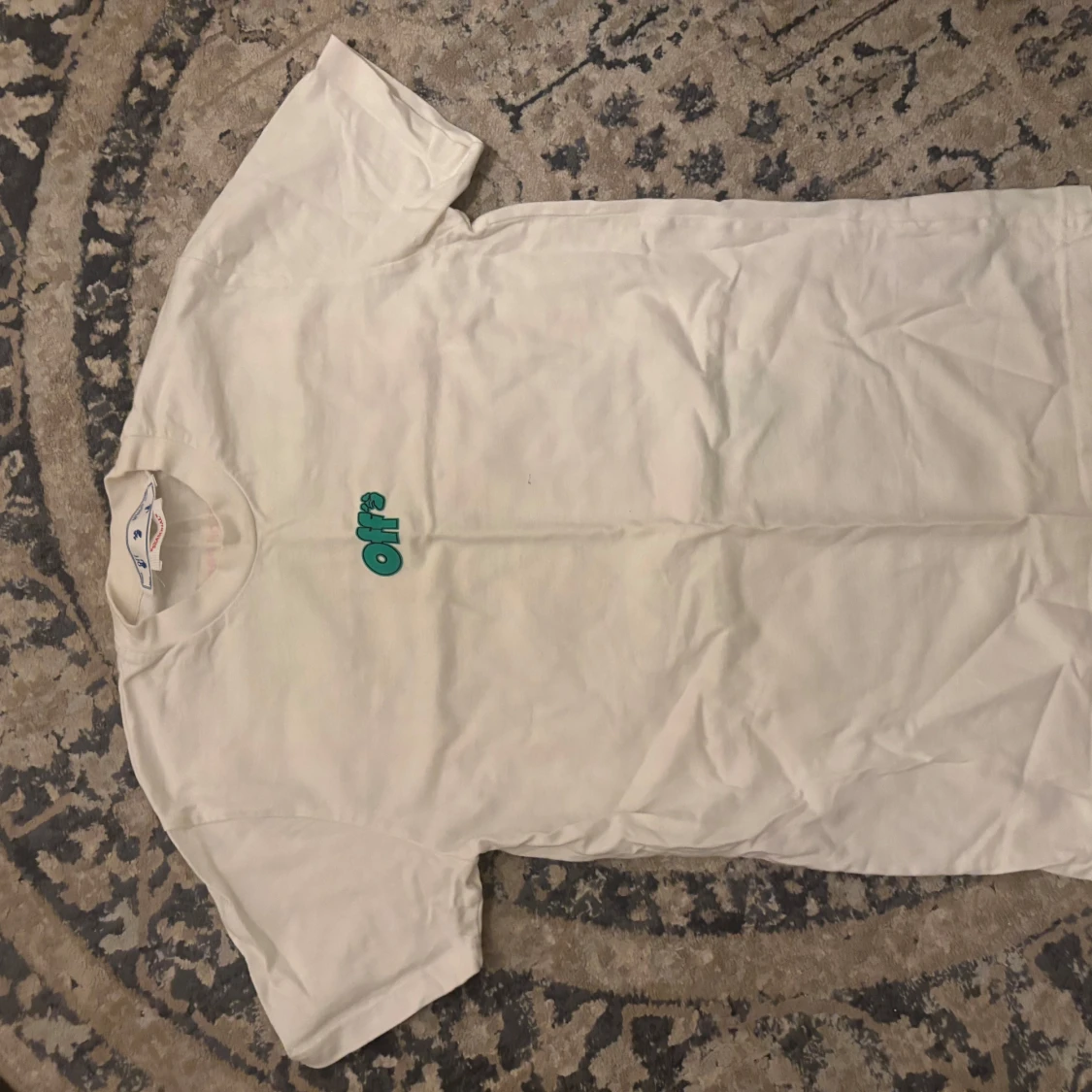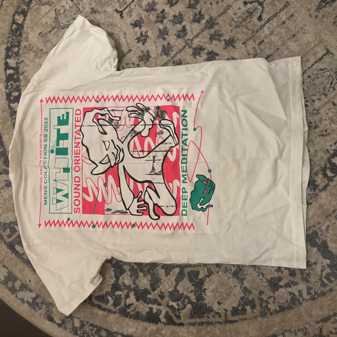Vit t-shirt från Off-White med coolt grafiskt tryck på ryggen i grönt, rosa och svart. Framsidan har en liten Off-White-logga i grönt. Klassisk passform med rund hals och korta ärmar. Perfekt för dig som gillar streetwear och unika prints.