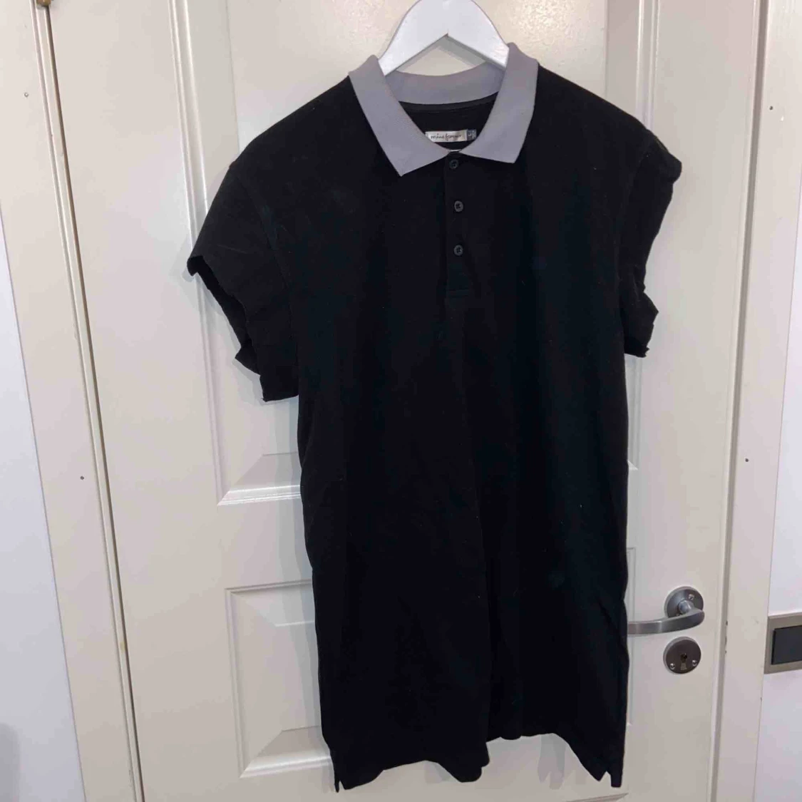 En svart piketröja med vit-grå krage. Använd en gång. Ärmarna är klippta lite halvslvarvigt.✨🌼