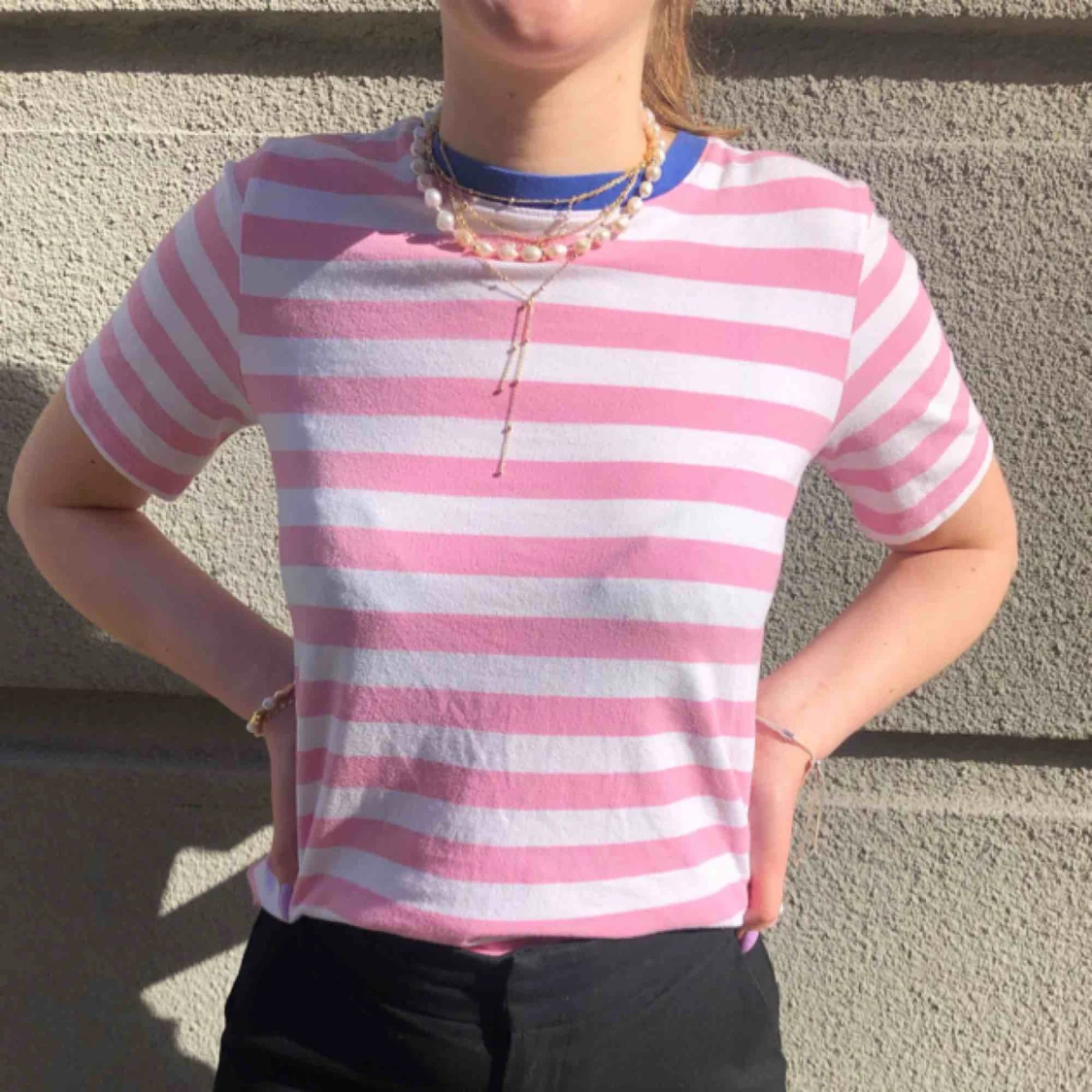 Rosa randig T-shirt med blå krage. Fint skick. Kund står för frakt.