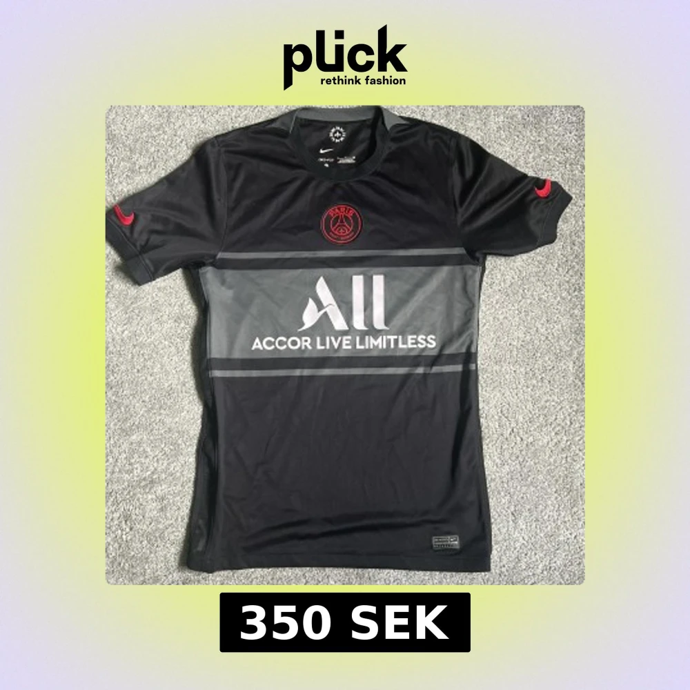 Säljer en svart PSG fotbollströja från Nike med röda detaljer och klubbmärke på bröstet. Tröjan har korta ärmar, Dri-FIT material och tryckt sponsorlogga. Tröjan är i princip perfekt skick förutom ett litet fel (bild 4). Köparen står för frakt. Medela mig om du har några frågor!