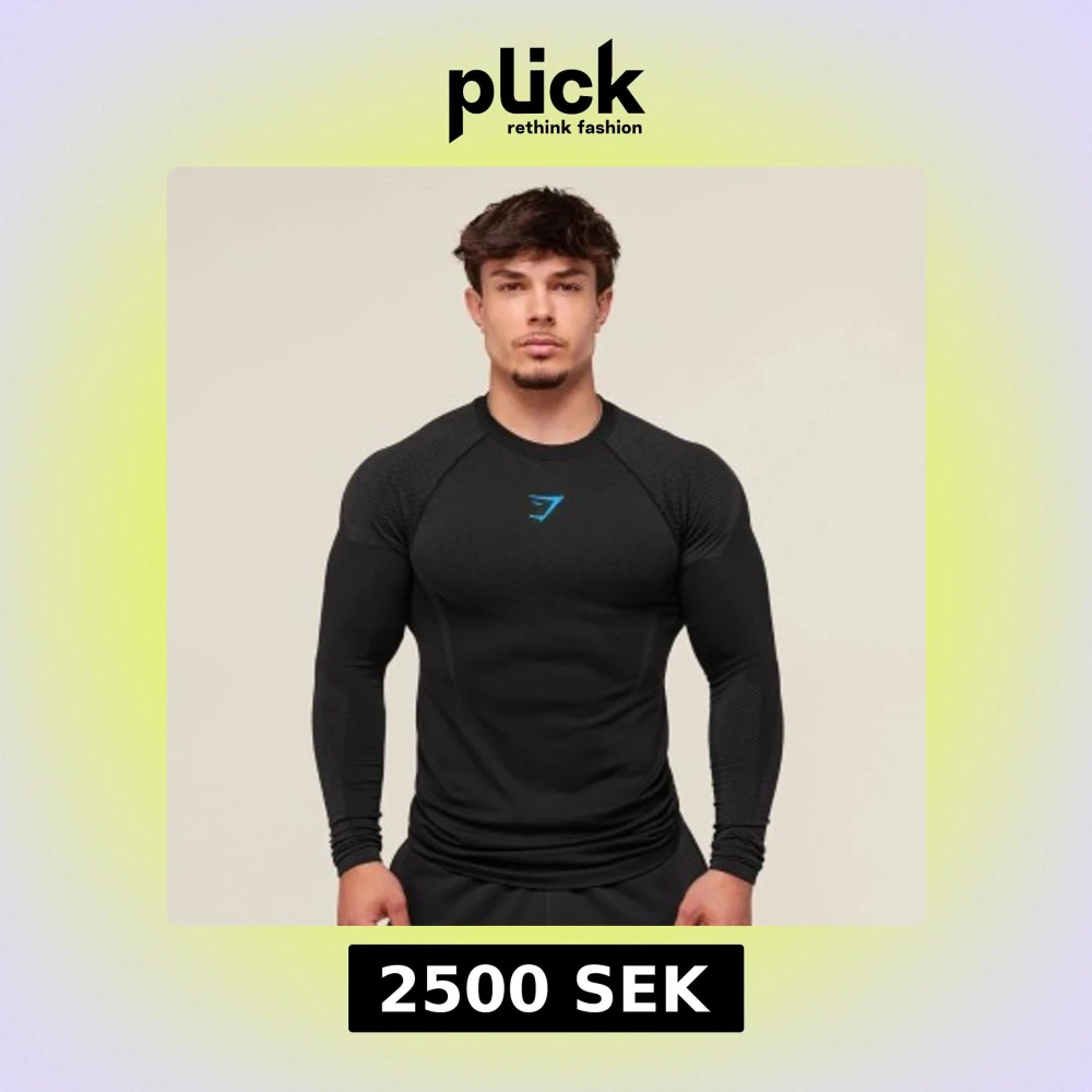 Svart långärmad träningströja från Gymshark med blå logga på bröstet. Tröjan är tight i passformen och tillverkad i ett syntetmaterial som andas, perfekt för gymmet. Snygga detaljer i tyget på axlar och ärmar för extra stil.
