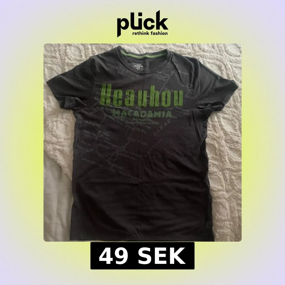 Svart t-shirt från H&M. med grön text 'Keauhou Macadamia' framtill och tryckt kartmönster. Klassisk rund hals med grön detalj på insidan av kragen. Skön passform och korta ärmar, perfekt för en chill stil.