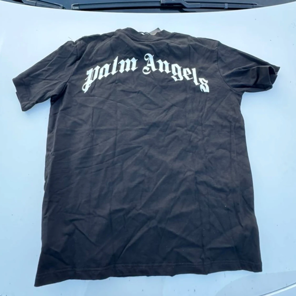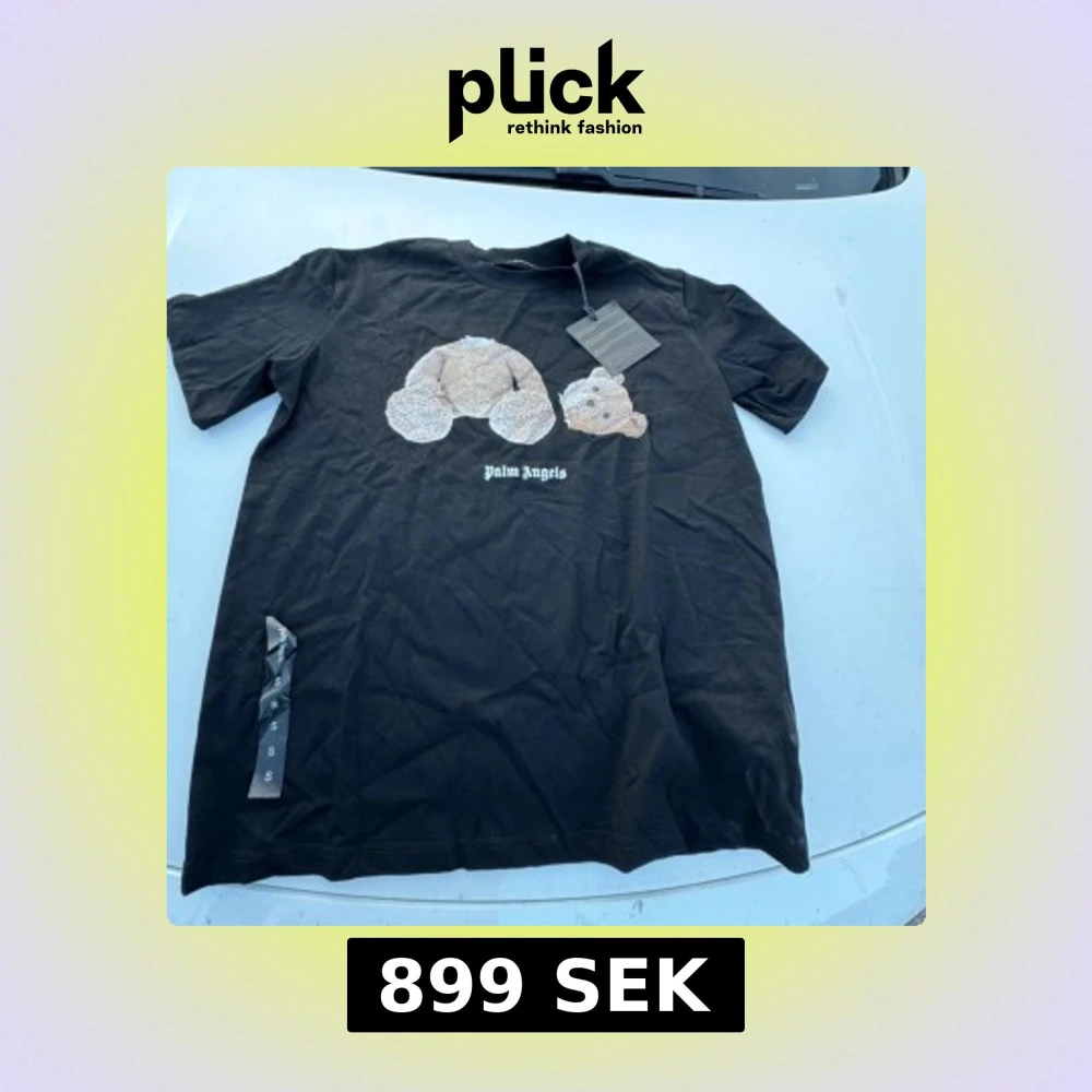 Snygg och oanvänd t-shirt från Palm Angels med ikoniskt björnmotiv på bröstet och stor logga på ryggen. Klassisk passform med korta ärmar och rund hals. Tillverkad i mjuk bomull, perfekt för en streetwear-look. Står S men passar mycket bättre som M.