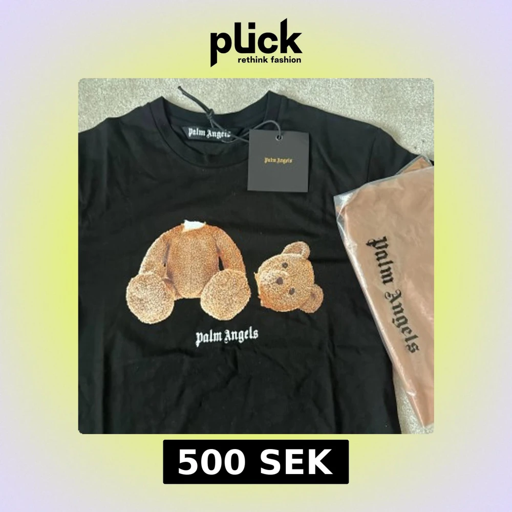 Svart t-shirt från Palm Angels med stort tryck av en nallebjörn på framsidan och vit Palm Angels-logga på ryggen. Klassisk rund halsringning och korta ärmar. Perfekt statement-plagg för streetwear-stilen.