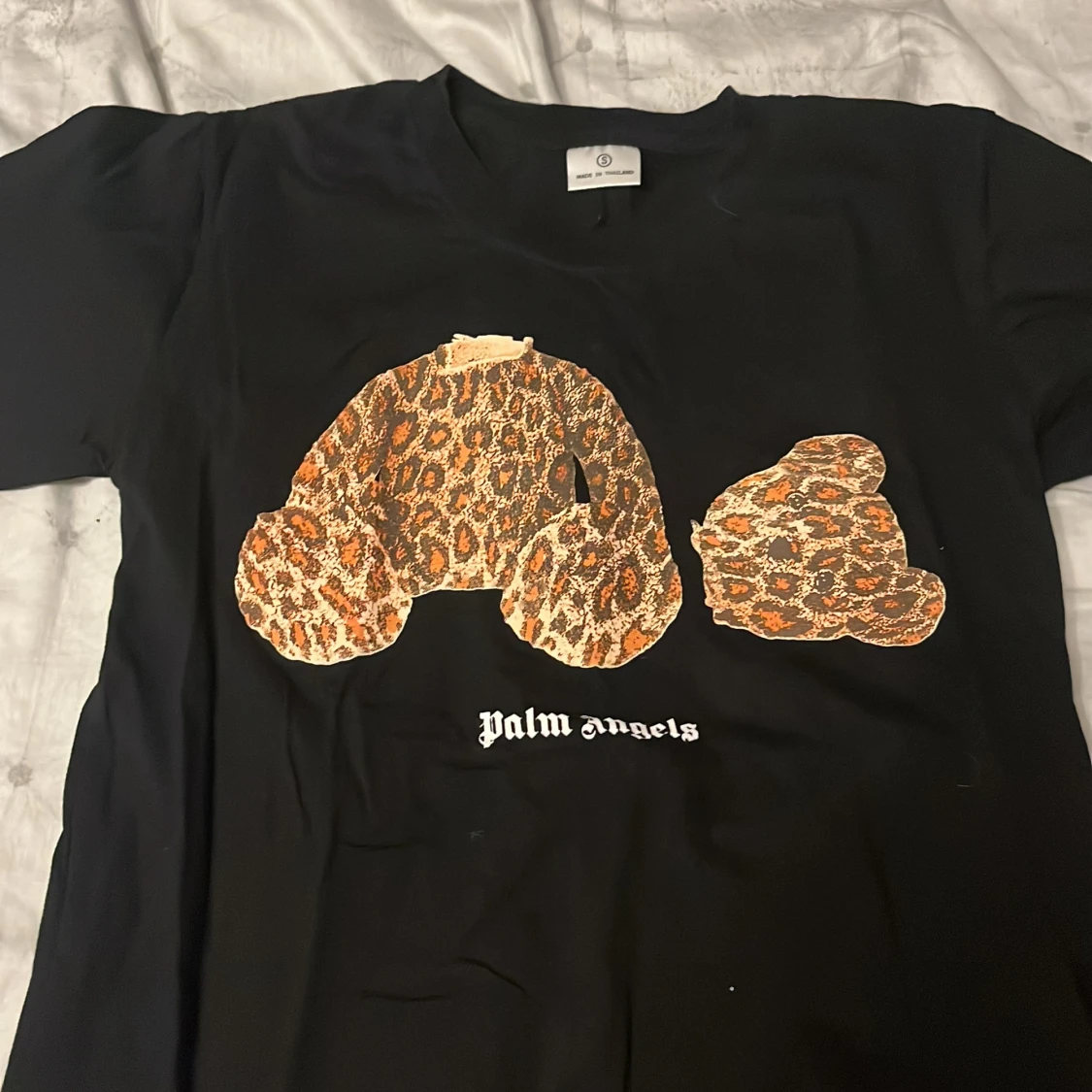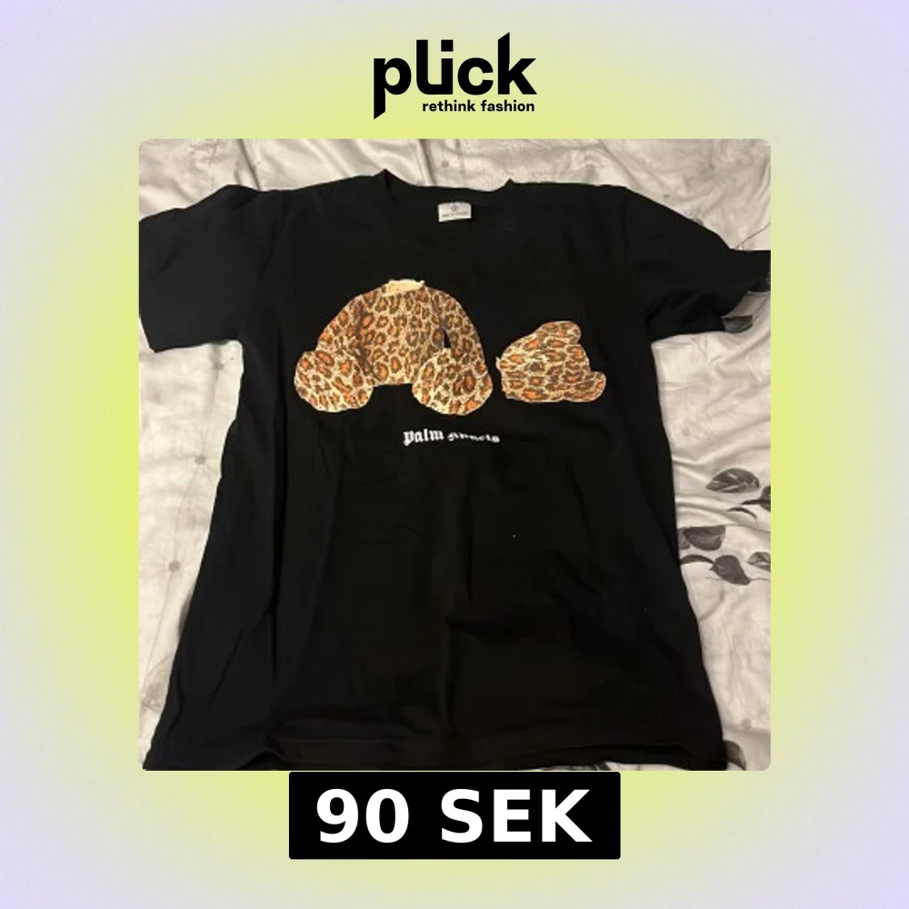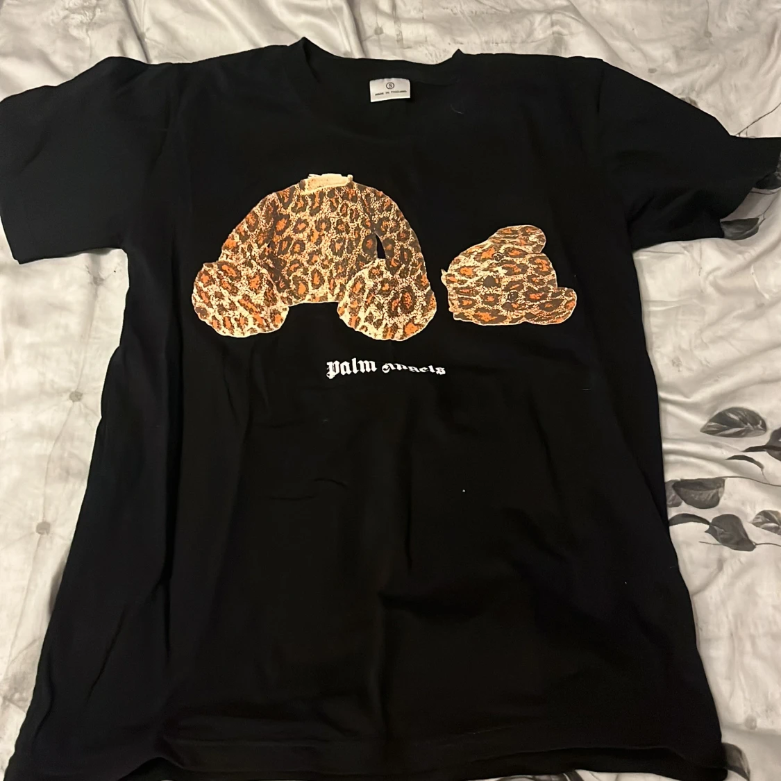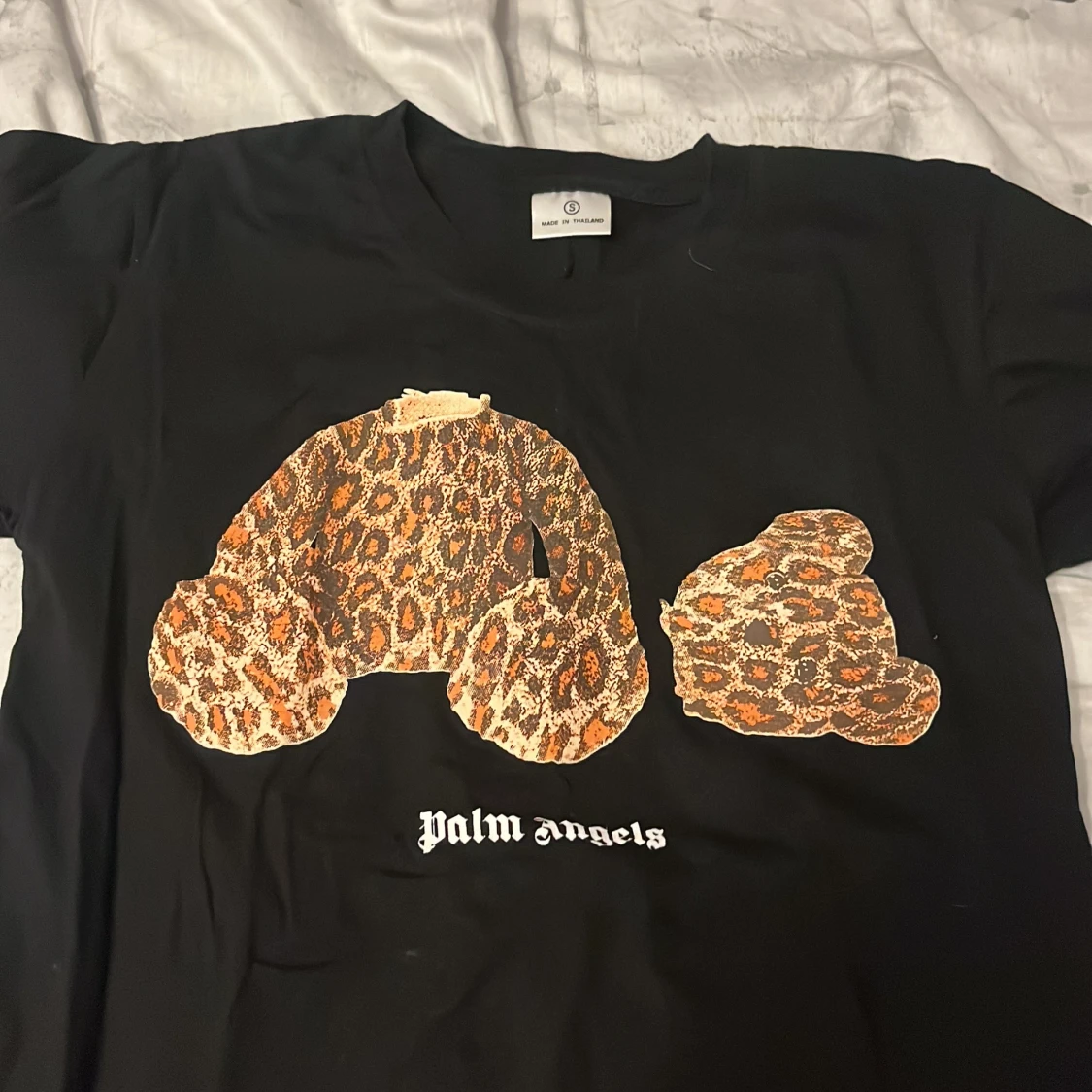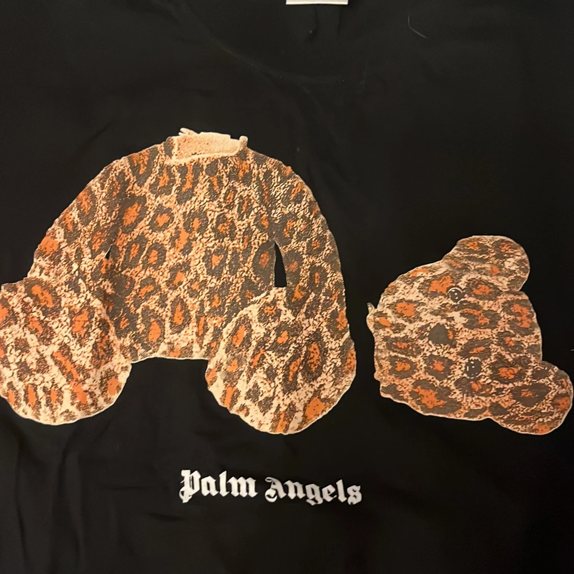 Svart t-shirt från Palm Angels med ikoniskt tryck av en leopardmönstrad nalle på bröstet och vit logga under. Klassisk passform och korta ärmar, perfekt för dig som vill sticka ut med streetstyle-vibe.