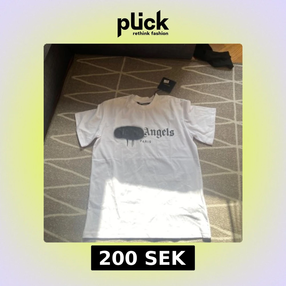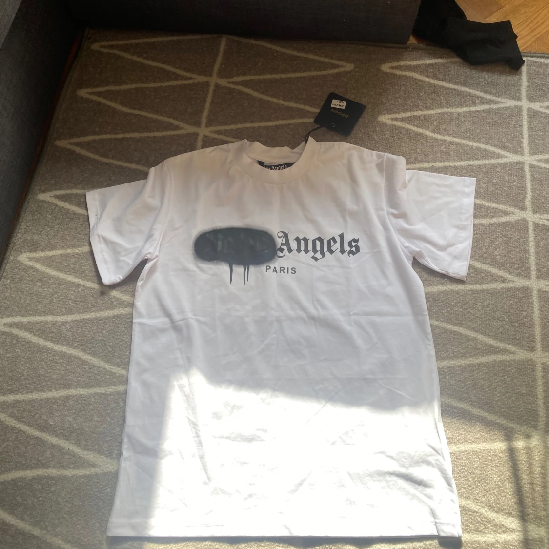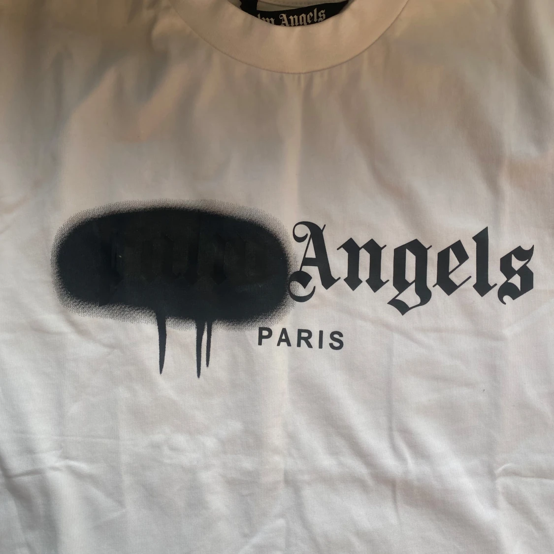 Vit t-shirt från Palm Angels med ikoniskt svart spray paint-tryck och texten 'Angels Paris' på bröstet. Klassisk passform med rund hals och korta ärmar. Tillverkad i mjuk bomull, perfekt för en clean streetwear-look.