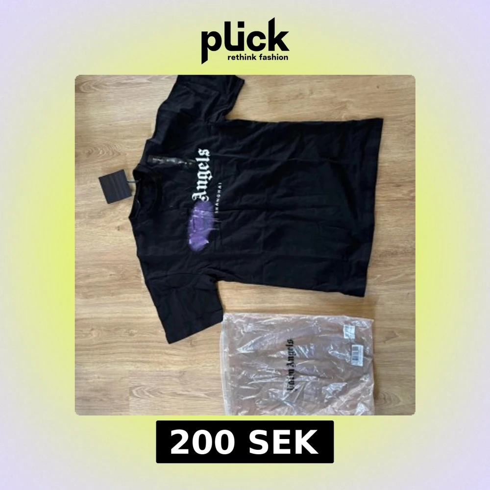 Säljer en svart t-shirt från Palm Angels med vit logga och lila tryck på bröstet. Klassisk passform och rund halsringning. Perfekt för dig som gillar streetwear och vill sticka ut med en ikonisk design.