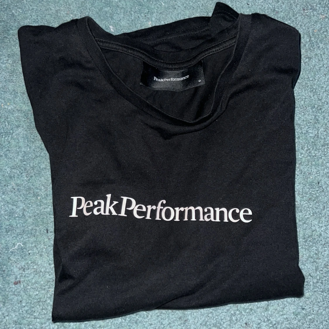 Svart t-shirt från Peak Performance med vit logga tryckt på bröstet. Klassisk rund halsringning och korta ärmar. Tillverkad i mjuk bomull för en skön känsla och enkel stil. Storlek är Xs men kan även passa för storlek 164-170 beroende på hur långa man är.