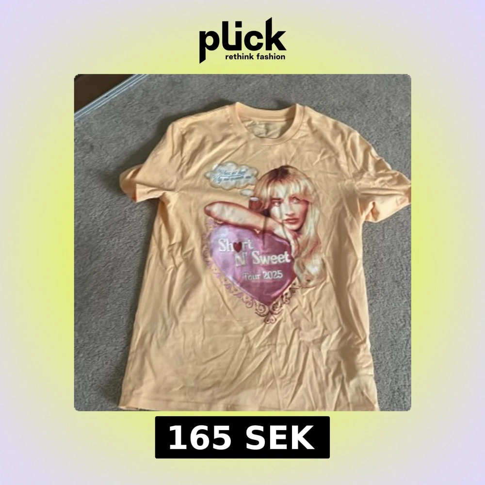 Persikofärgad t-shirt med stort tryck framtill av en blond tjej och texten 'Short N' Sweet Tour 2025'. Rund halsringning och mjukt material i 100% bomull. Perfekt för dig som gillar unika bandtröjor och snygga tryck.