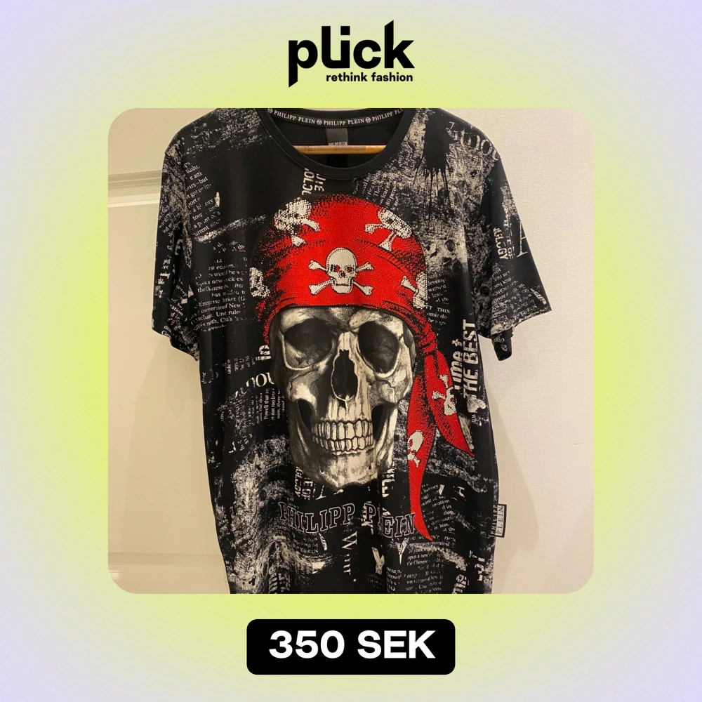 Svart t-shirt från Philipp Plein med ett stort dödskallemotiv och röd bandana. T-shirten har korta ärmar och är täckt av text och mönster i vitt och rött.