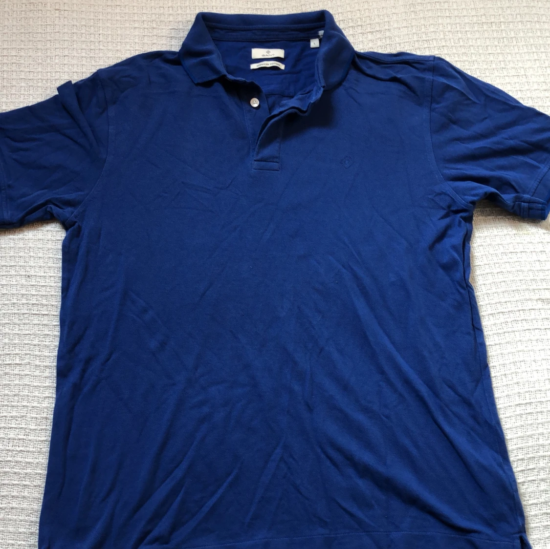 Säljer en klassisk blå pikétröja från Gant i 100% bomull. Tröjan har korta ärmar, krage med två knappar och diskret broderad logga på bröstet. Perfekt för en stilren och avslappnad look.