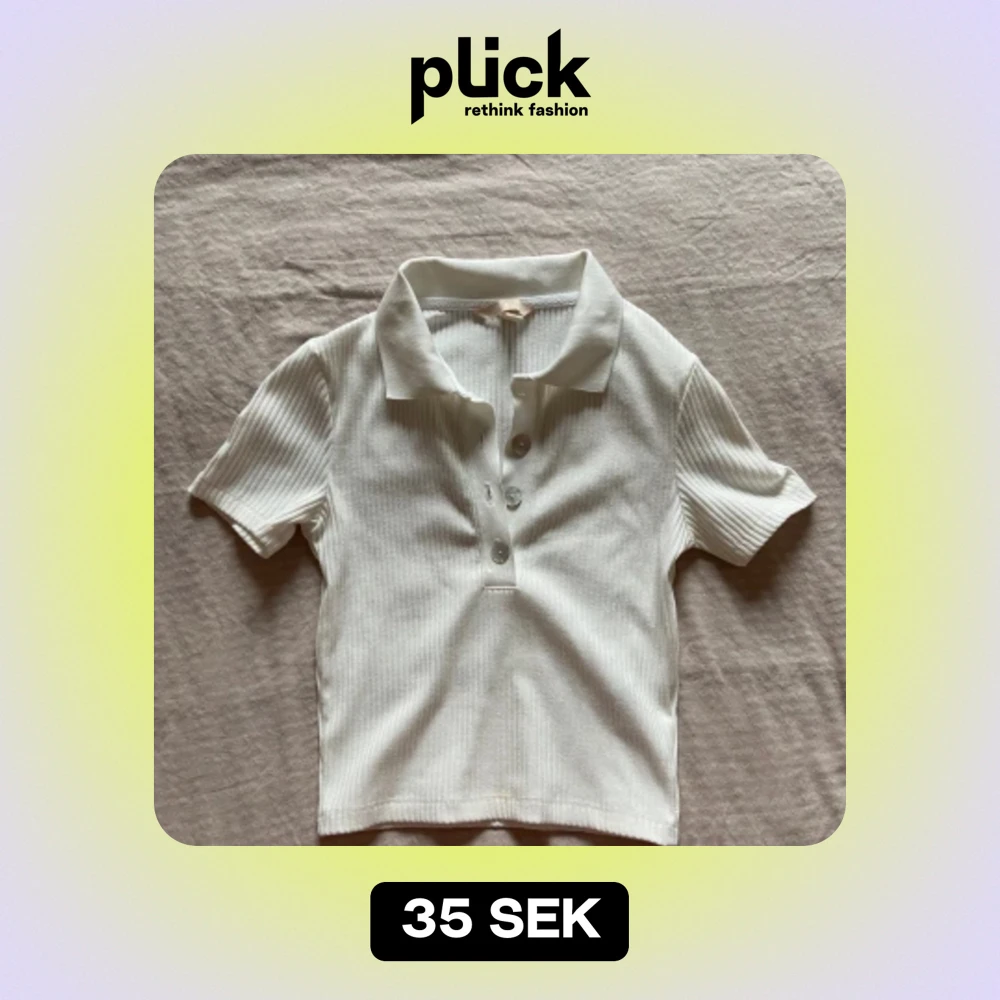 Vit ribbad piké från H&M. Storlek S. En knapp saknas högst upp men extraknappen finns kvar på lappen inuti tröjan.