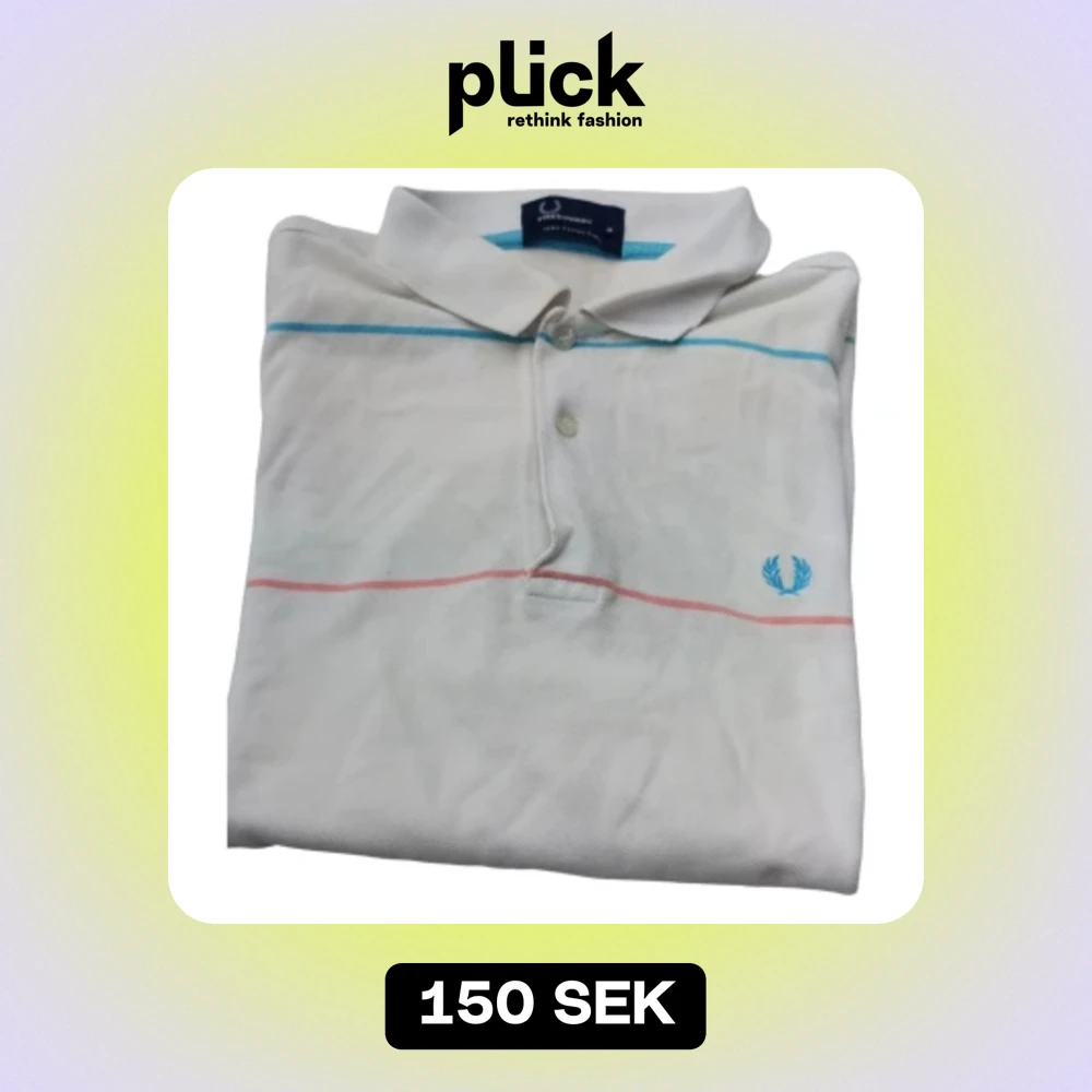 En fin vit Fred Perry pike med ljusa färgade ränder i strl Medium. I bra begagnat skick.