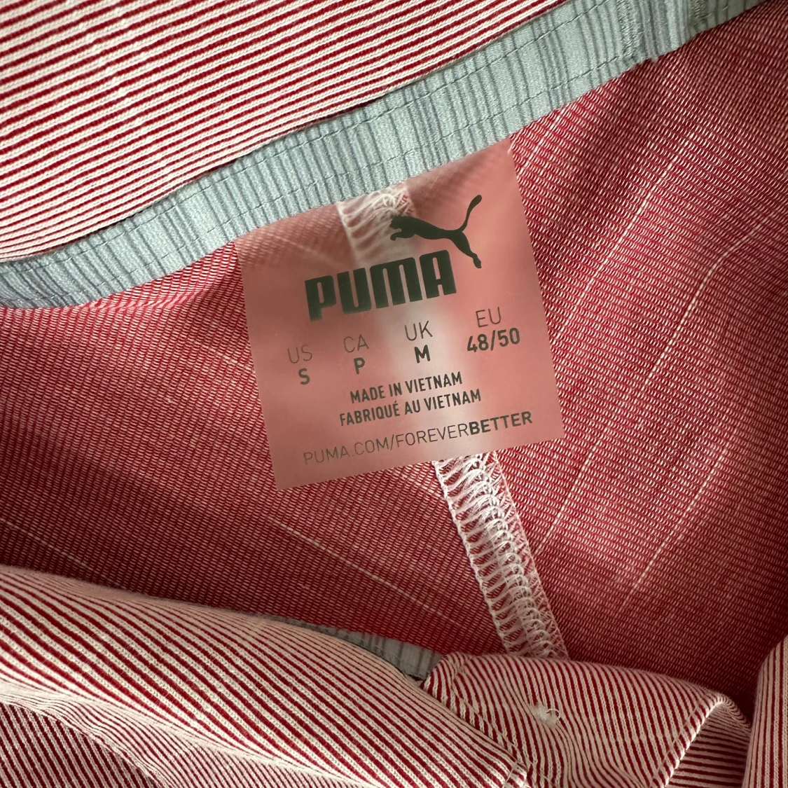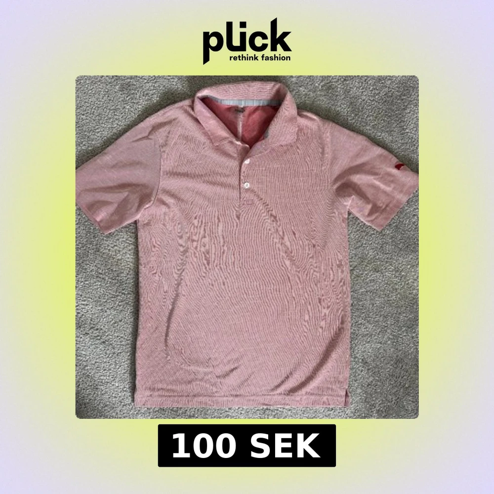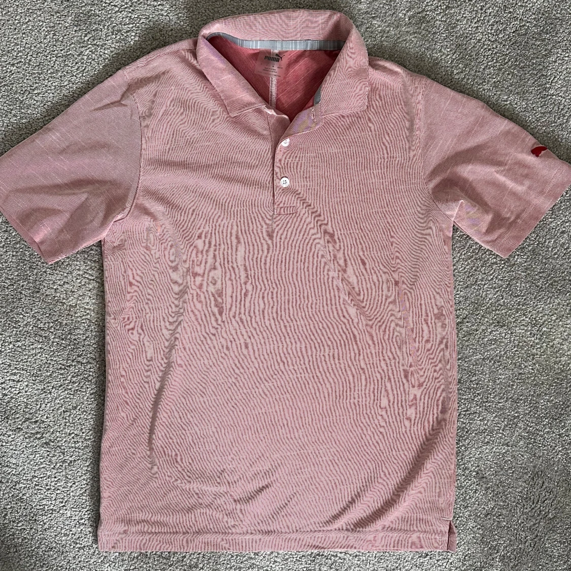 Säljer en klassisk golfpikétröja från Puma i röd- och vitrandigt mönster. Tröjan har korta ärmar, krage och tre knappar framtill. Herr stl M. Nyskick.