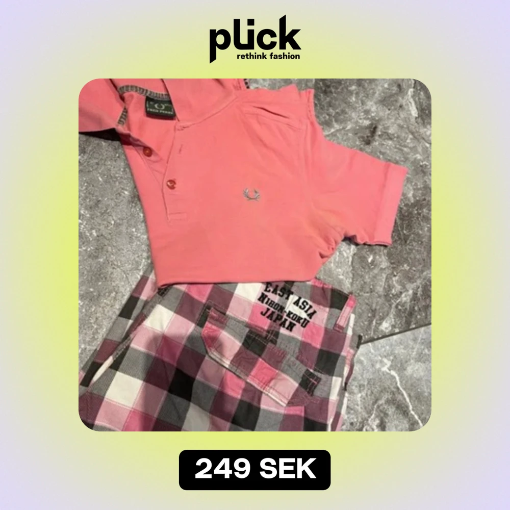 En rosa Fred Perry polotröja med grå detaljer runt kragen och knapparna. Shortsen är i rosa, svart och vitt rutmönster med fickor på sidorna. Köpt utomlands