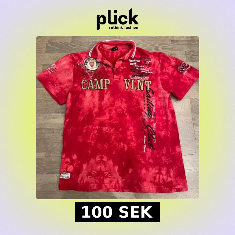 Säljer en röd tie-dye t-shirt från Camp VLNT med broderade och tryckta detaljer, text och emblem på bröstet och ärmarna. T-shirten har krage med vita ränder och korta ärmar. Perfekt för dig som gillar unika och färgstarka plagg. Tröjan är 4xl men sitter som L. Tröjan knappast använd och skit fet👍
