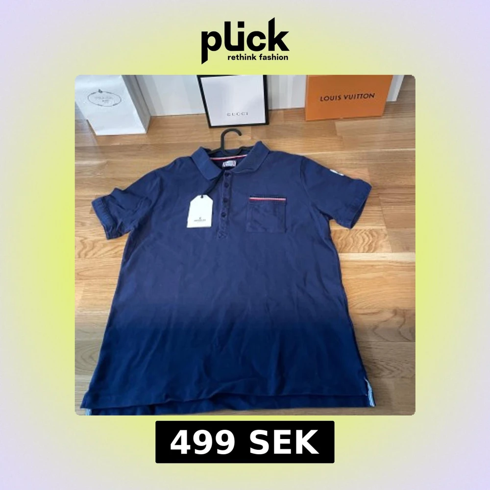 Säljer en helt ny stilren mörkblå pikétröja från Moncler i strl large. Tröjan har en liten bröstficka med röd och vit detalj samt en diskret logga på ärmen. Perfekt för en avslappnad men ändå elegant look.