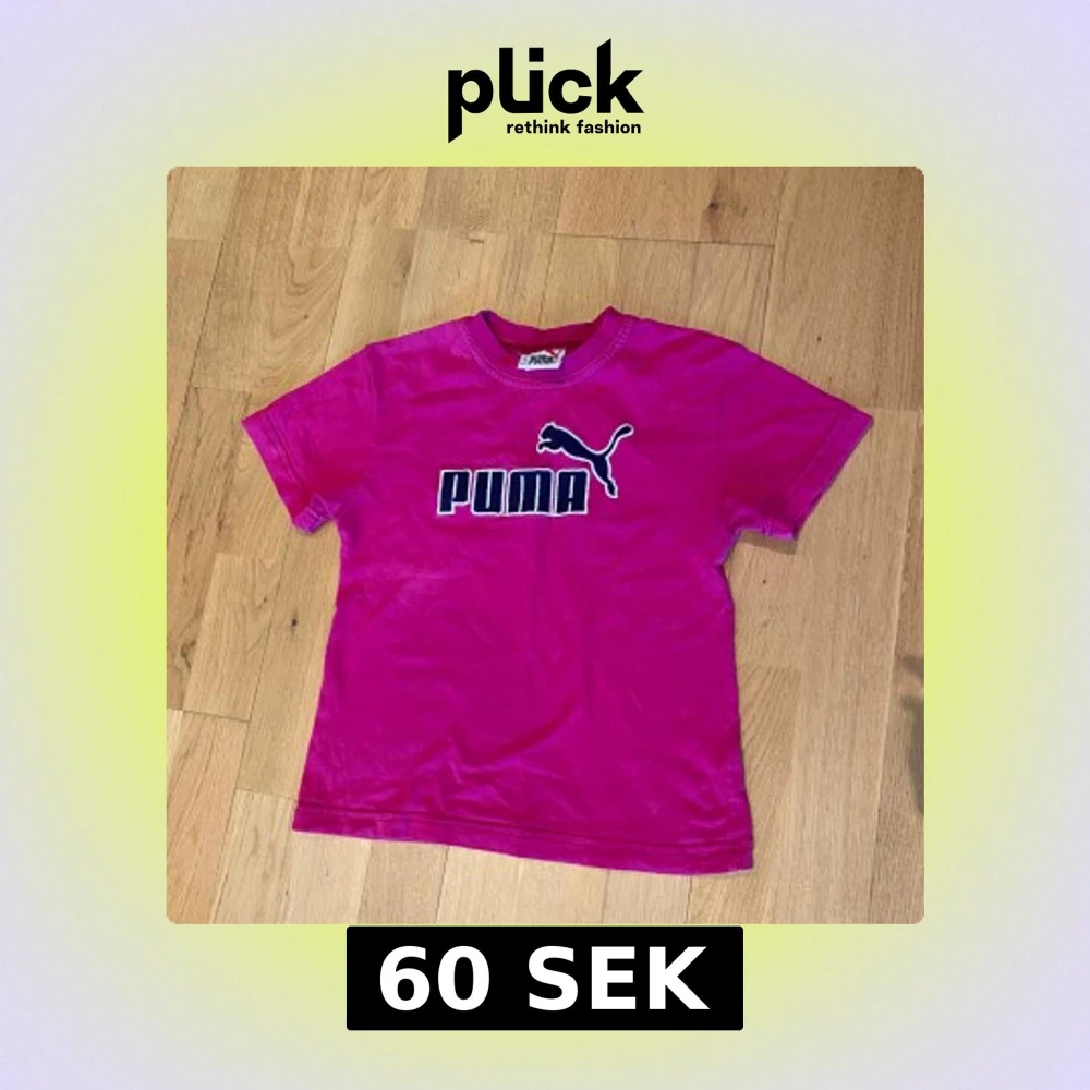 Säljer en rosa t-shirt från Puma med logga och text framtill.