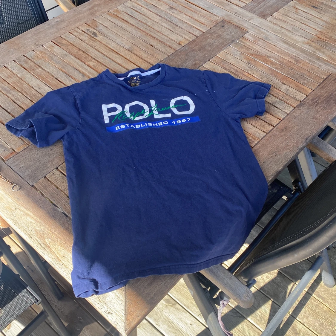 Tjo säljer en tvär fet marinblå Polo sport t-Shirt med en skön logga på framsidan. Använd mycket men inga defekter förutom att det kommit lite färg vi bröstet. S-M