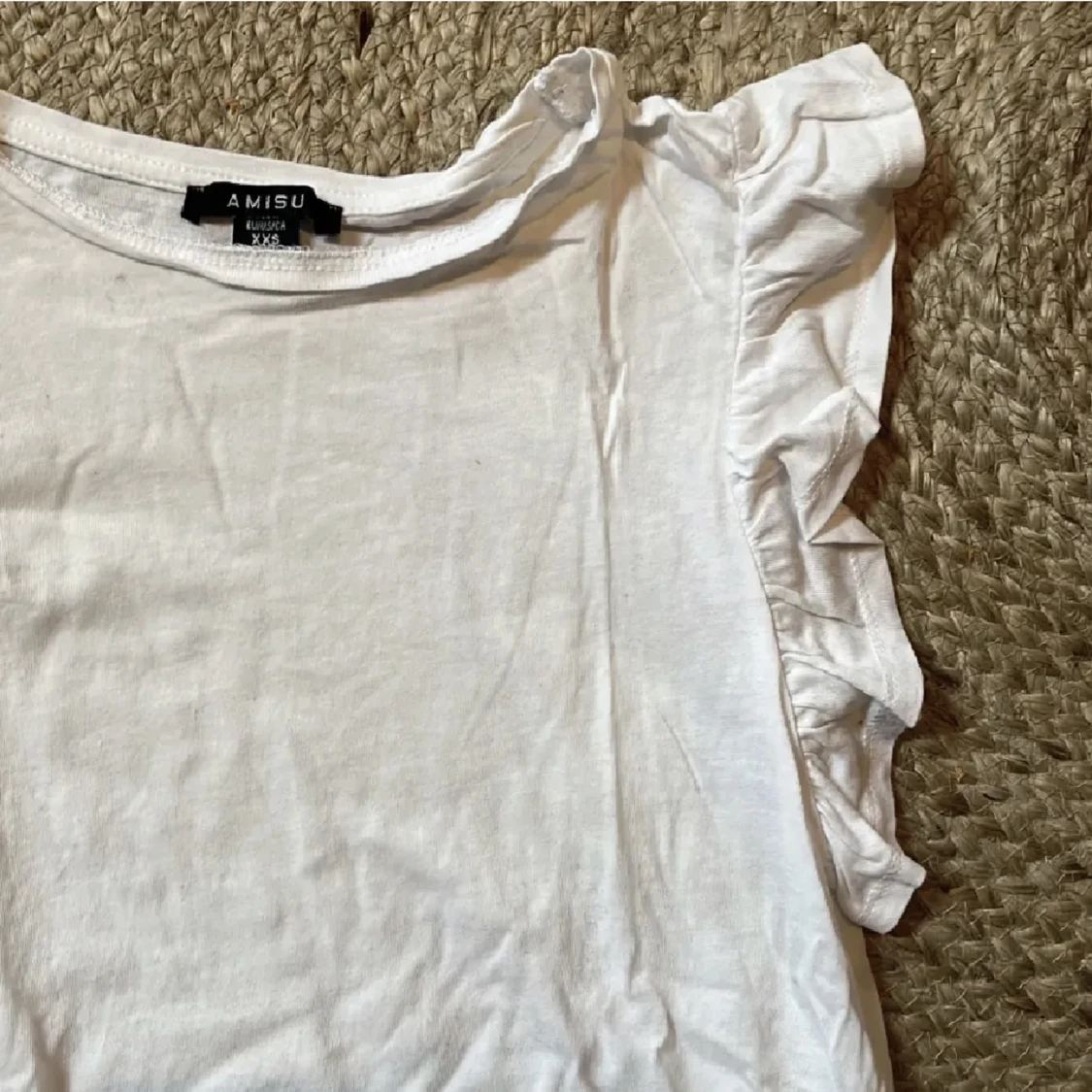 Säljer denna fina vita t-shirt/linne med volang. Köpt på new yorker. Är i storlek xxs men skulle säga att den passar xs också🫶🏼