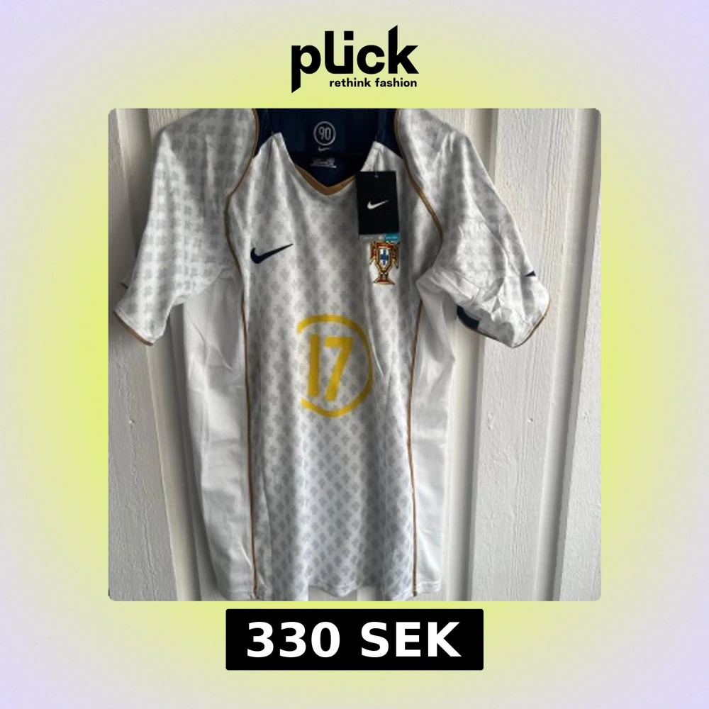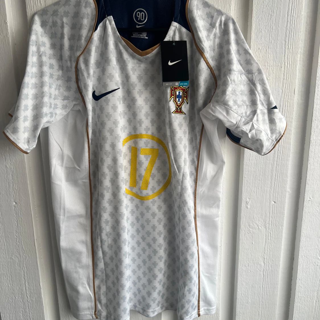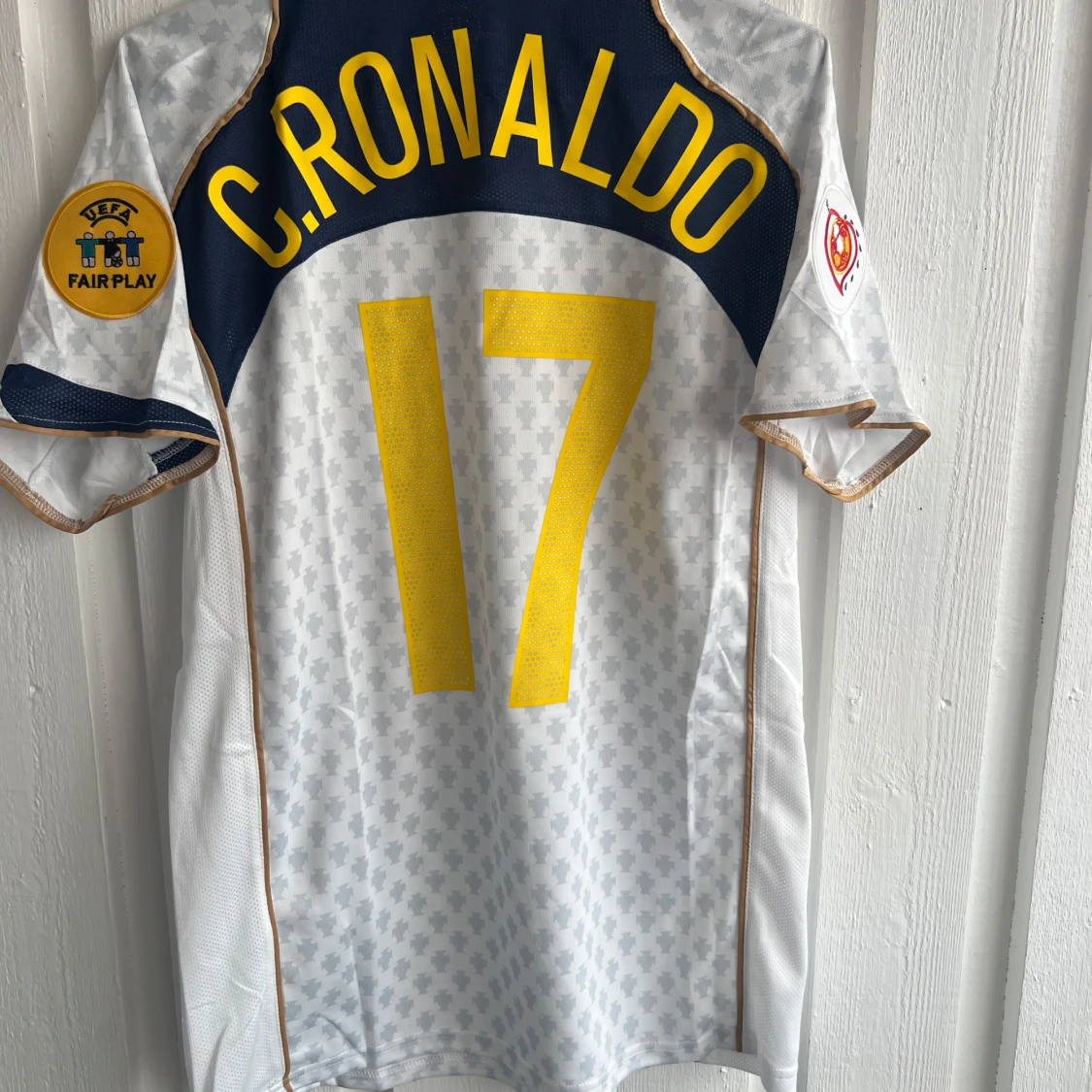 Snygg Portugal fotbollströja från Nike med C. Ronaldo och nummer 17 i gult på ryggen och bröstet. Tröjan är vit med ljusgrått mönster, korta ärmar och guldfärgade detaljer längs kanterna. UEFA Fair Play-märke på ärmen och Portugal-emblem på bröstet. Perfekt för fans!