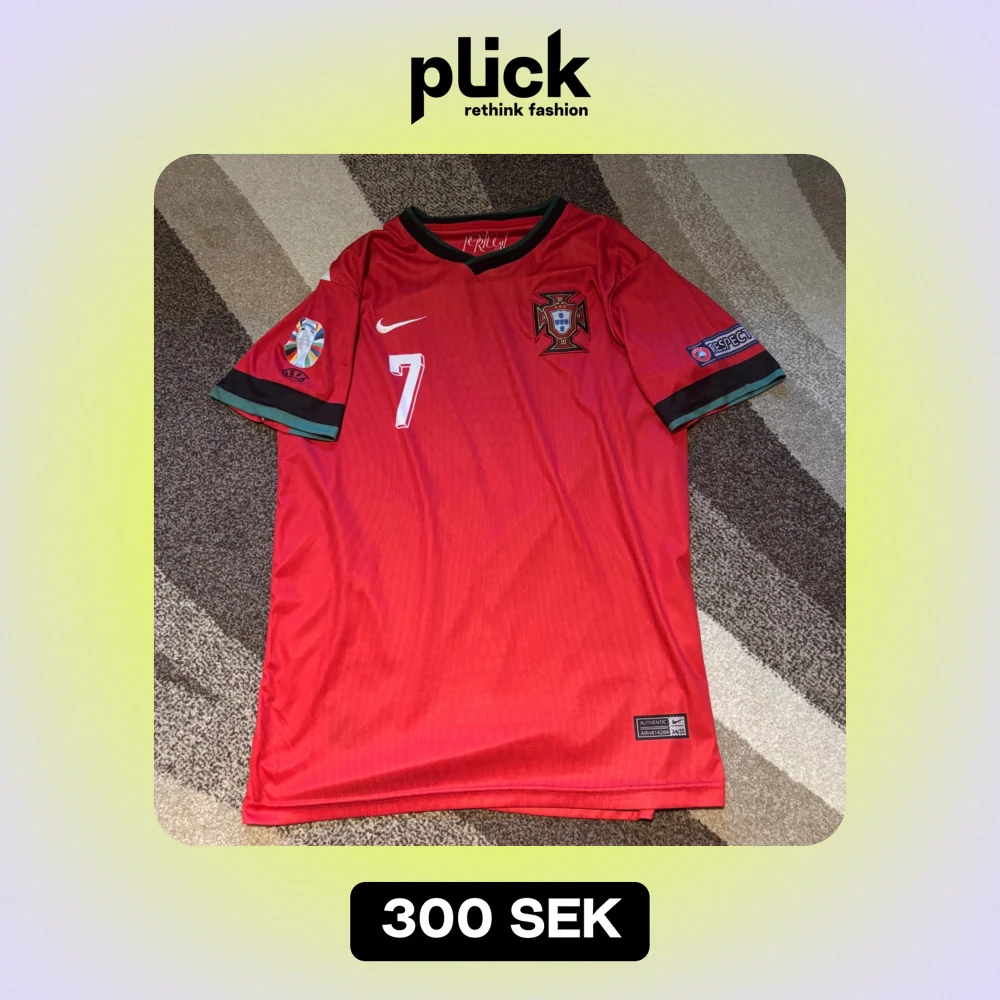 Säljer en röd Portugal fotbollströja från Nike med nummer 7 och namn på baksidan. Tröjan har korta ärmar och är i Dri-FIT material för bra komfort. Perfekt för fotbollsfans! 🇵🇹
