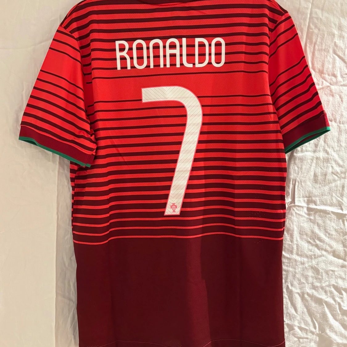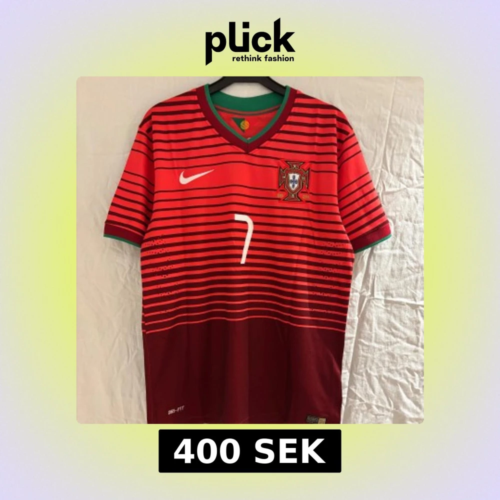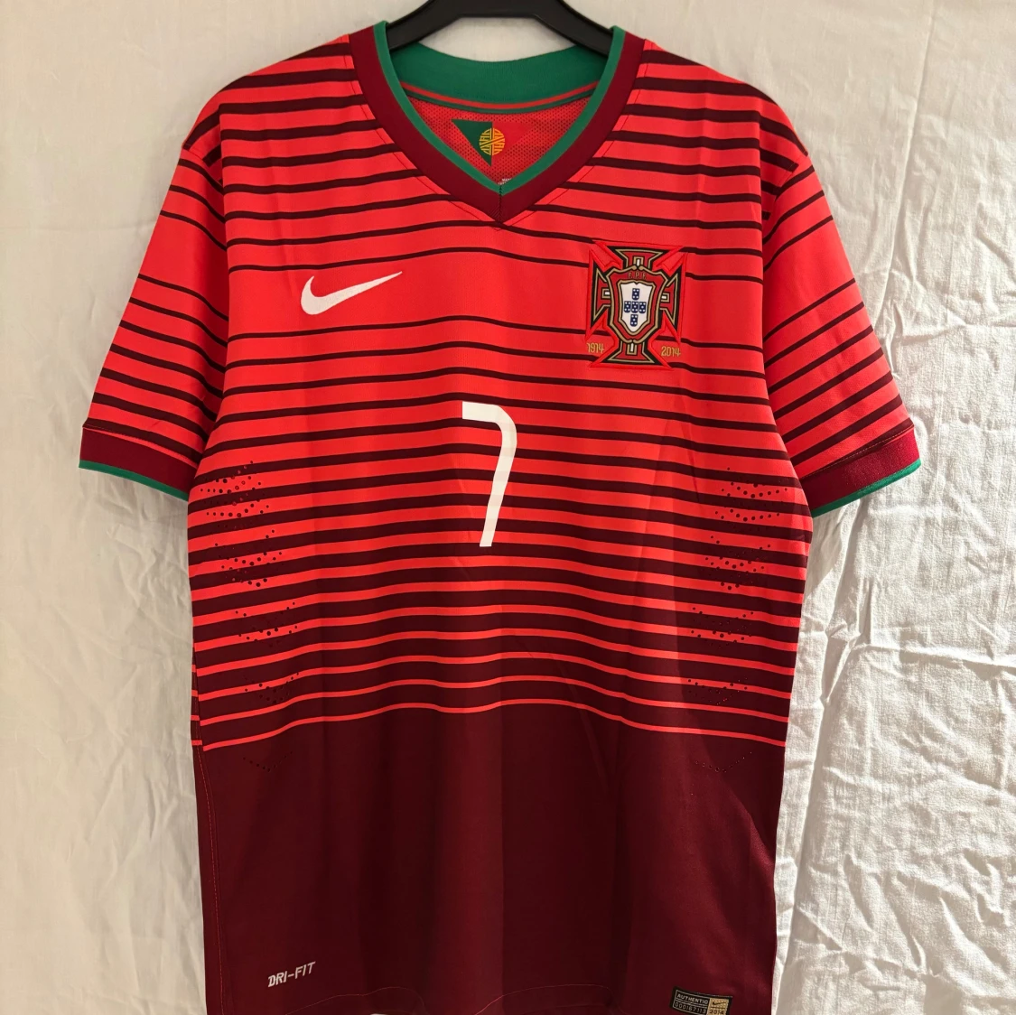 Portugal landslagströja från Nike med Ronaldo 7-tryck. Röd och vinröd med svarta horisontella ränder, gröna detaljer vid krage och ärmslut. Broderat landslagsmärke, Dri-FIT-material för bra andningsförmåga. Retro 2014-modell.