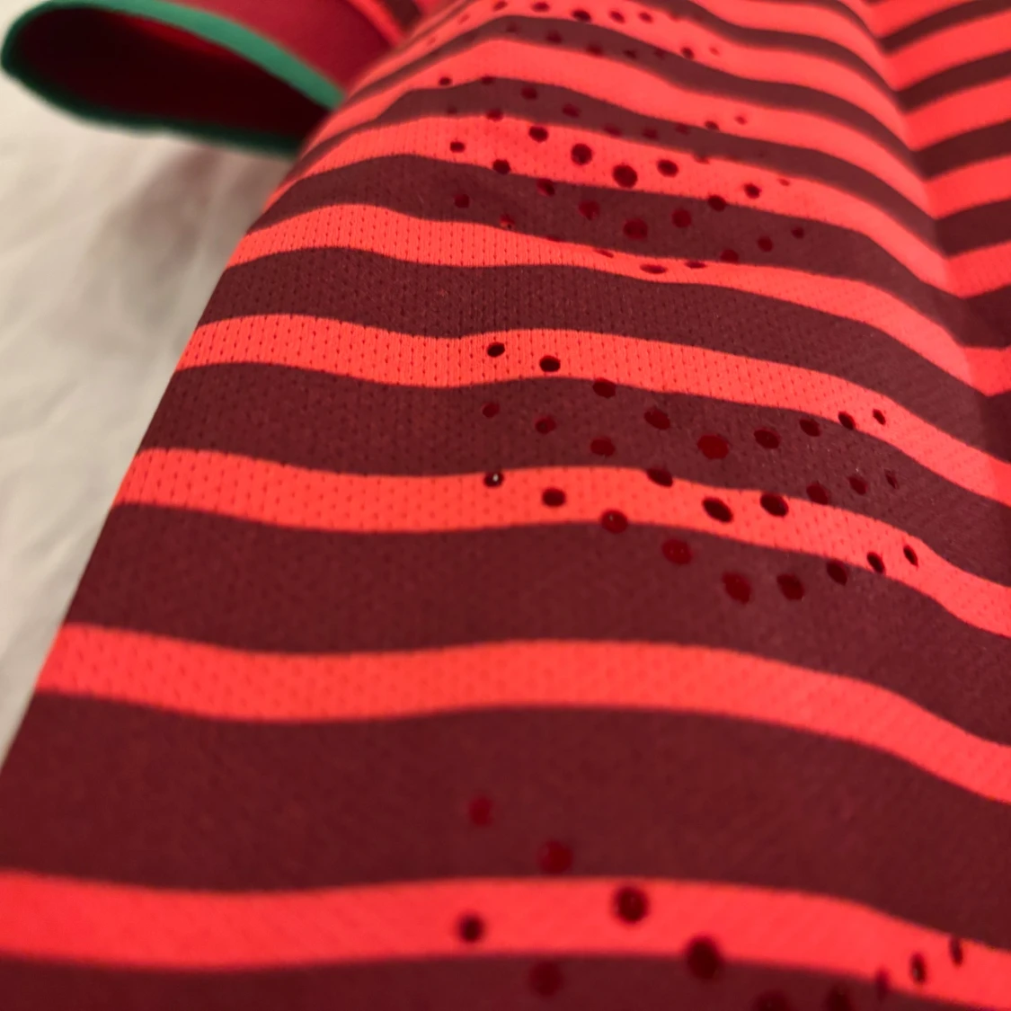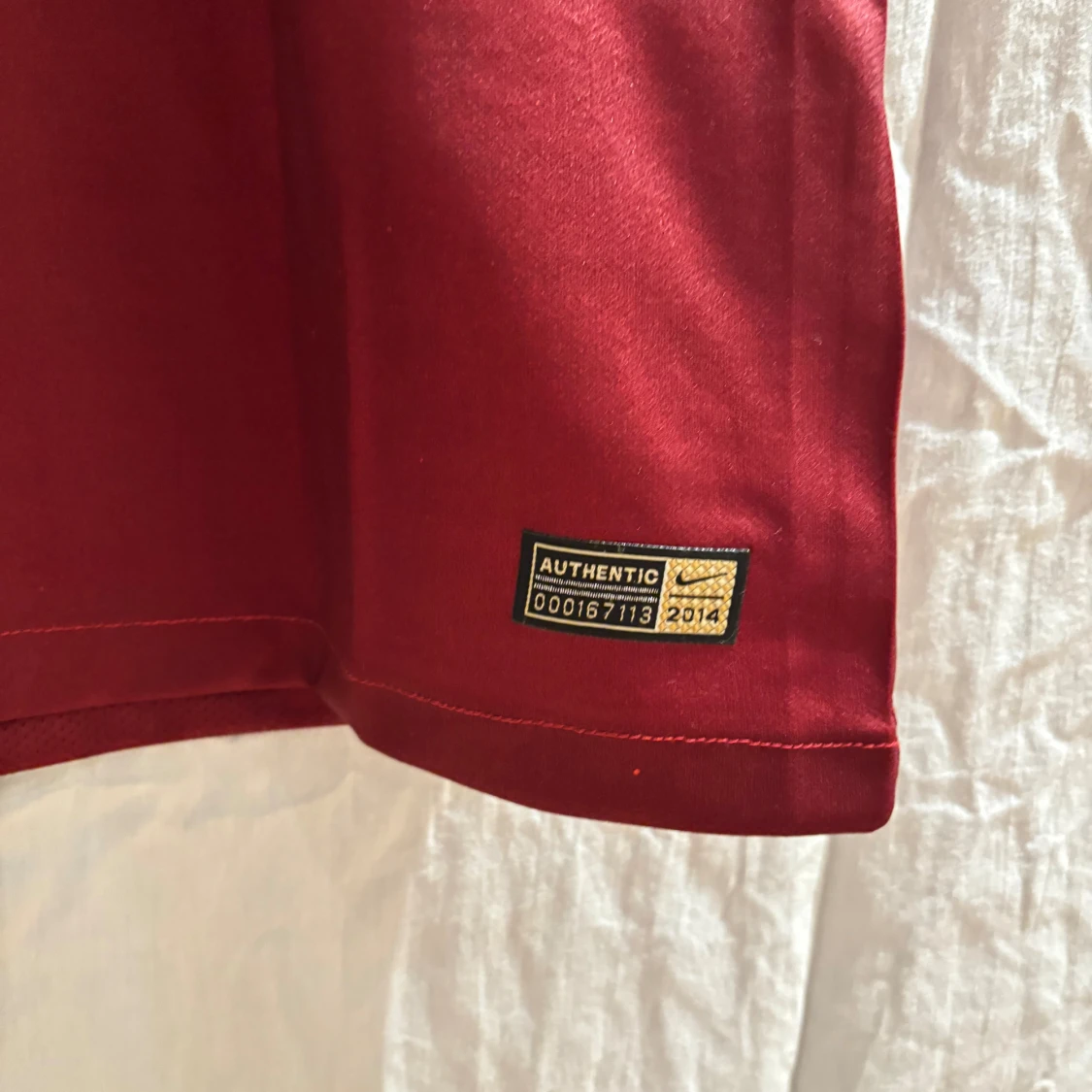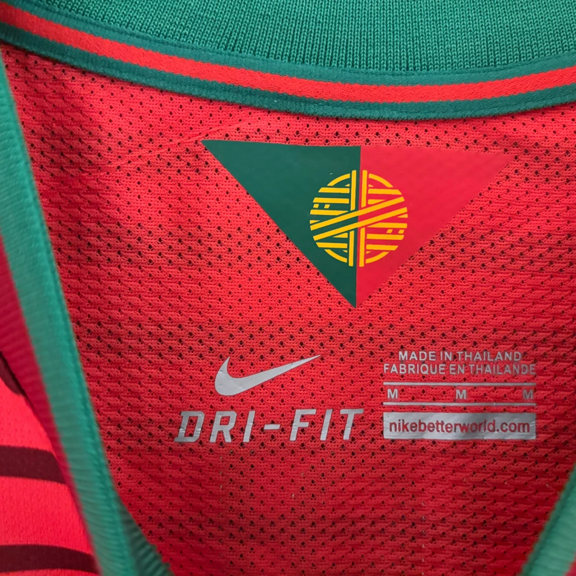 Portugal landslagströja från Nike med Ronaldo 7-tryck. Röd och vinröd med svarta horisontella ränder, gröna detaljer vid krage och ärmslut. Broderat landslagsmärke, Dri-FIT-material för bra andningsförmåga. Retro 2014-modell.