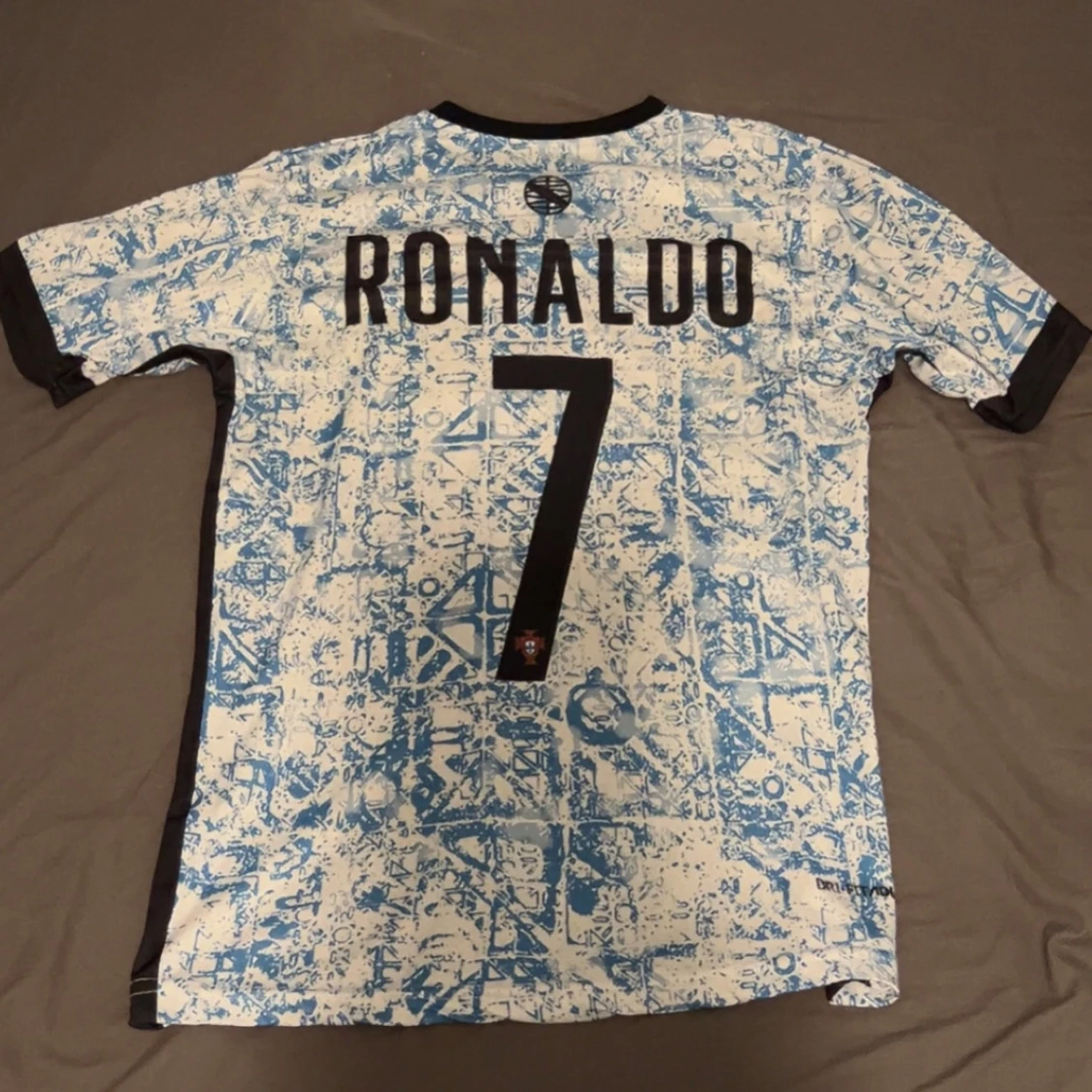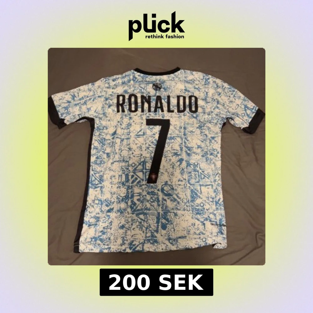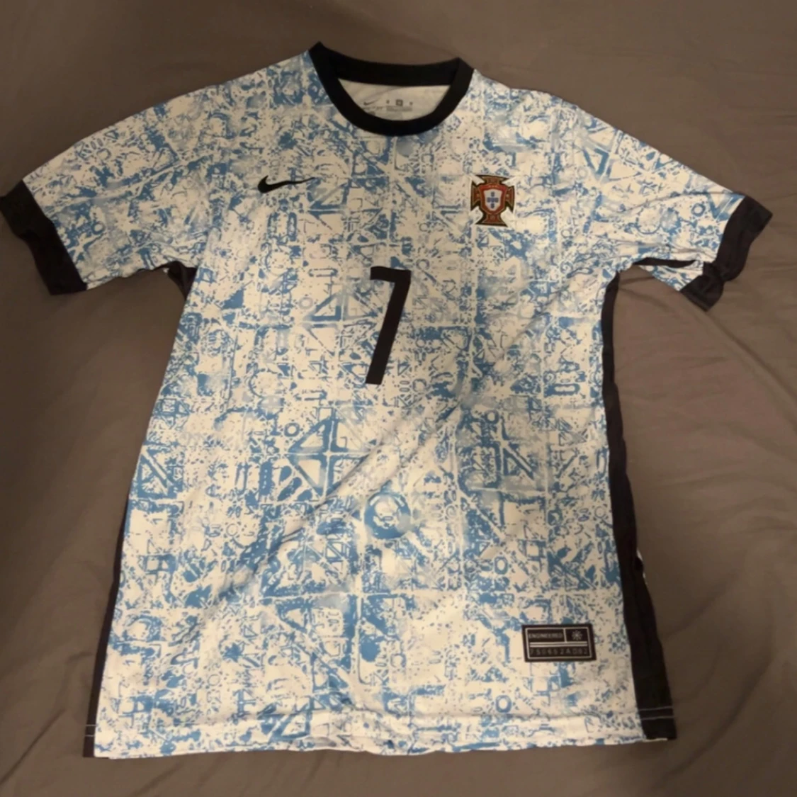 Snygg Portugal fotbollströja från Nike med Ronaldo och nummer 7 på ryggen. Tröjan är vit med ljusblått abstrakt mönster, svarta detaljer vid krage och ärmslut samt Portugal-emblem på bröstet. Perfekt för dig som vill sticka ut på match eller träning.