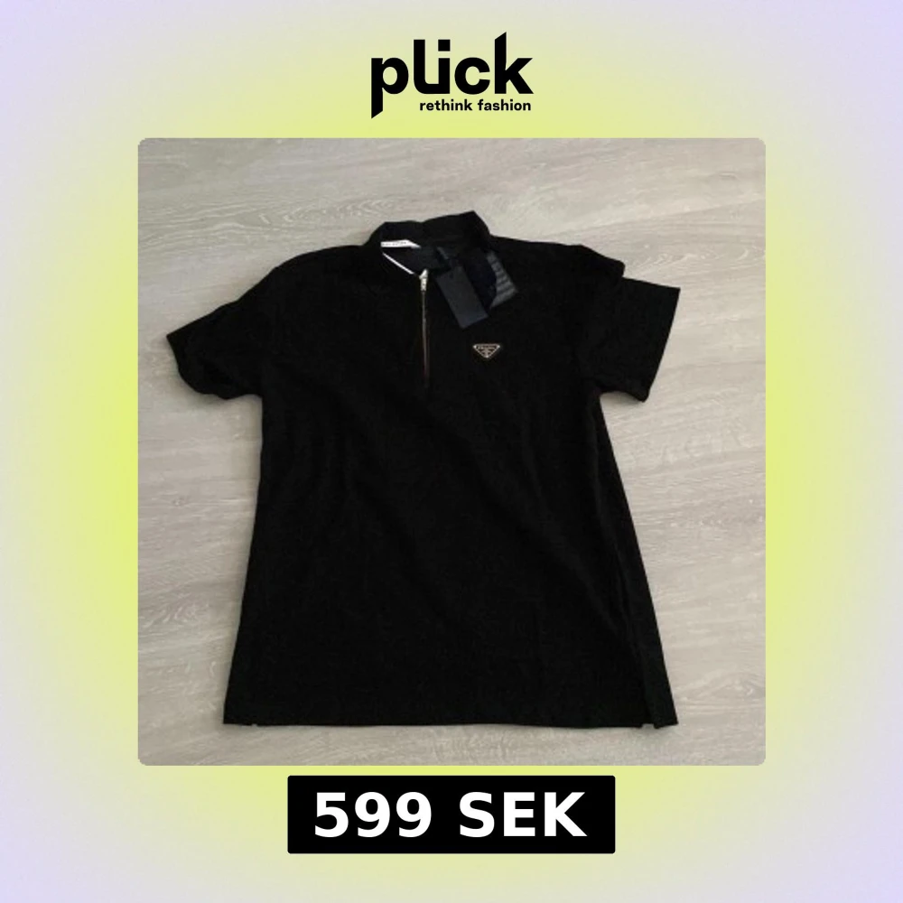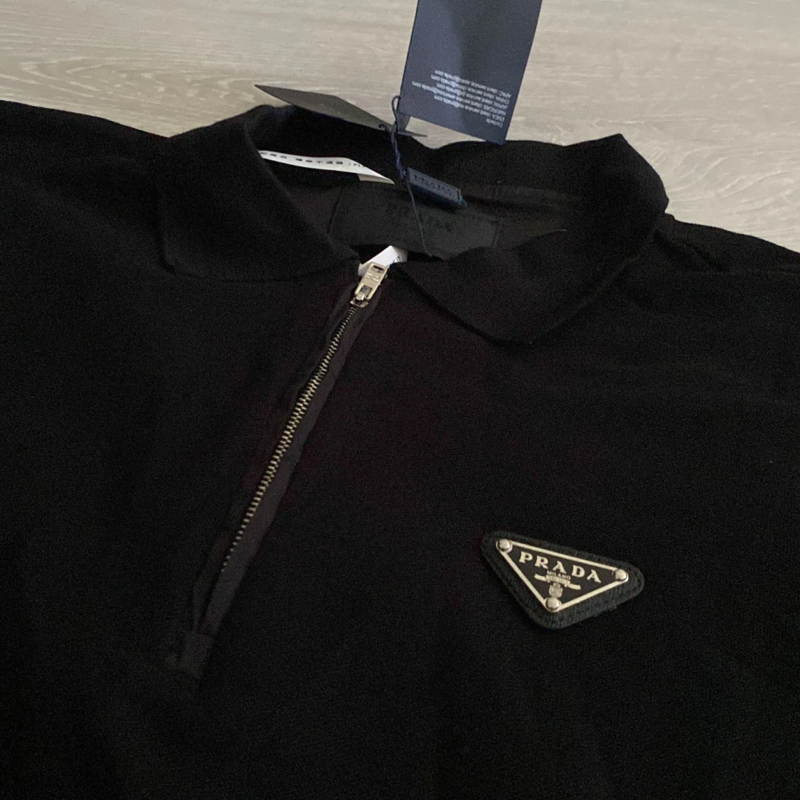 Svart pikétshirt med klassisk krage och halv dragkedja framtill. Tröjan har ett diskret Prada-emblem på bröstet och är tillverkad i mjuk bomull. Perfekt för dig som gillar stilrena och exklusiva plagg.