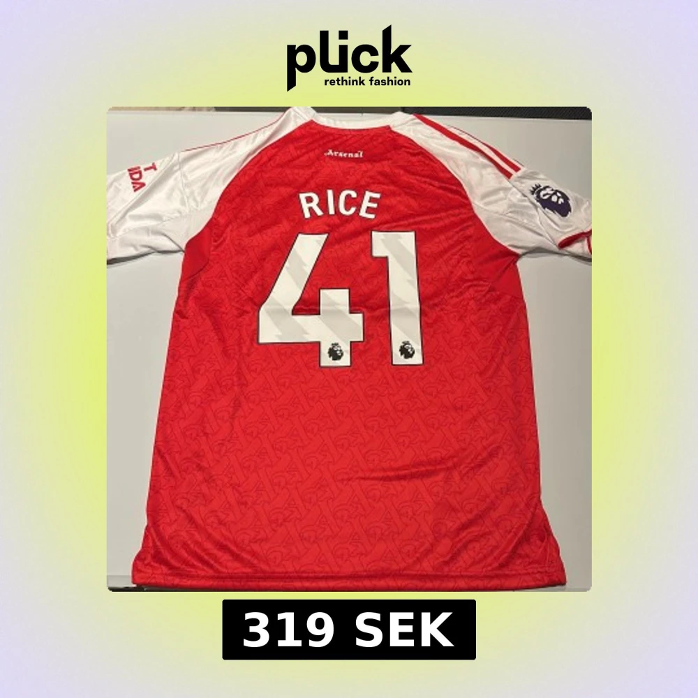 Arsenal hemmatröja med Rice 41-tryck, officiell Premier League badge på ärmen. Röd kropp med vita ärmar och röda ränder, broderad Arsenal-logga och Adidas-märke. Tillverkad i lätt, ventilerande polyestermaterial med subtilt mönster i tyget. Replika, endast handtvätt gäller!