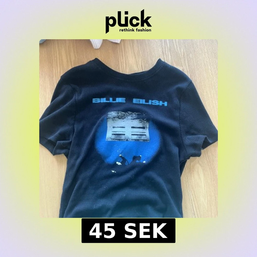 Cool svart t-shirt från Billie Eilish x Primark med blått tryck och motiv på framsidan. Storlek: S. Den är lite kroppad, tröjan går lite under naveln. Inte använd, och har bra skick.