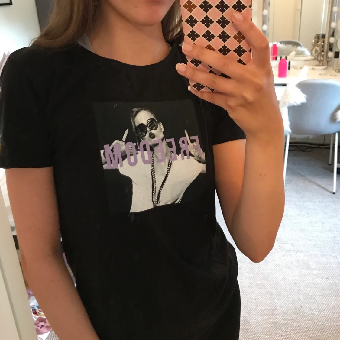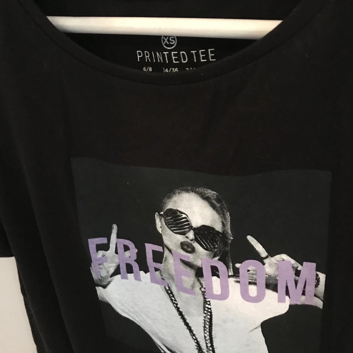 En jättefin svart t-shirt med ett tryck ”freedom” och en bild. Väldigt fint skick. Köpt på Primark. I storlek XS. Frakt tillkommer som köparen står för. Priset går att diskutera. Vid frågor så är det bara att höra av sig.