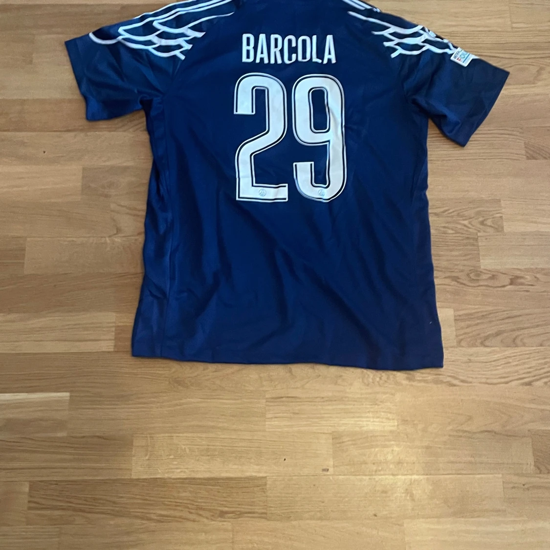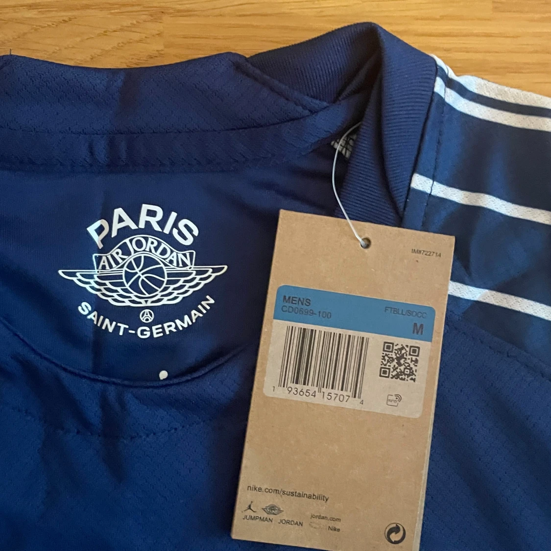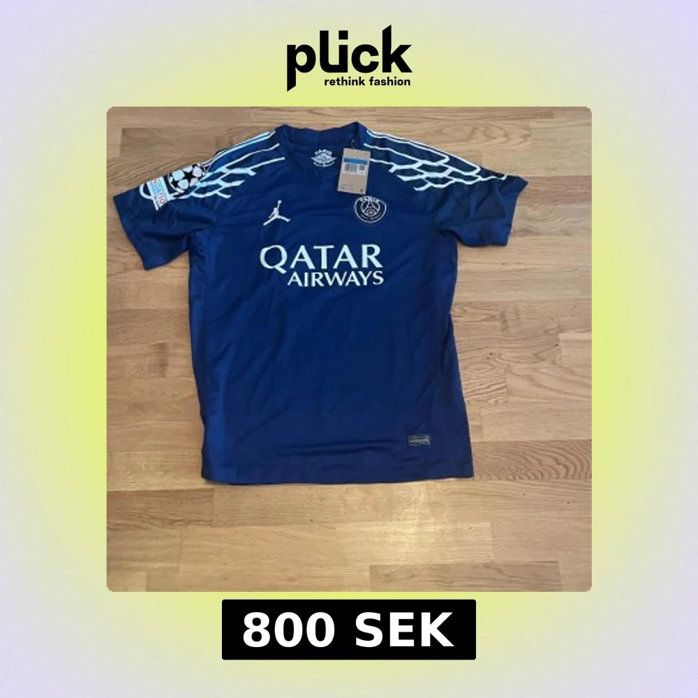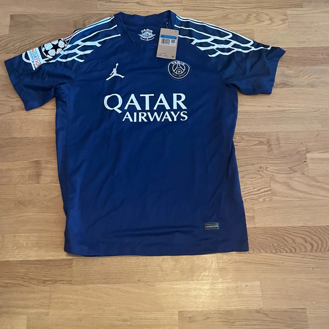 Paris Saint-Germain fotbollströja med Barcola 29-tryck, tillverkad i lätt och ventilerande material. Djupblå färg med vita detaljer, Jordan-logga och Qatar Airways sponsortryck. Snygga mönstrade axelpartier och klassisk passform.