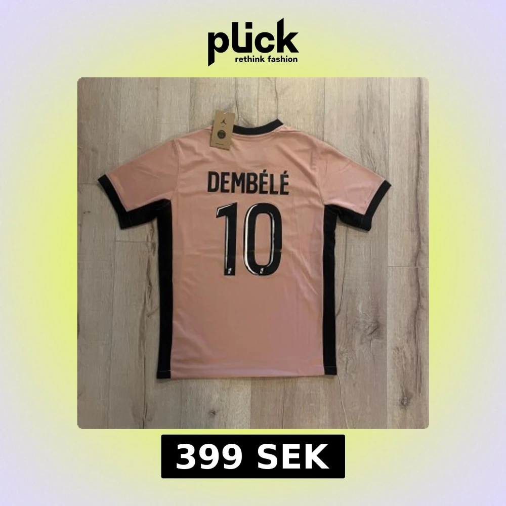 Snygg PSG fotbollströja i ljusrosa med svarta detaljer och tryck. Dembélé #10 på ryggen, Jordan-logga och Paris Saint-Germain-märke på bröstet. Qatar Airways sponsortryck. Tillverkad i lätt polyester med korta ärmar och V-ringad krage.
