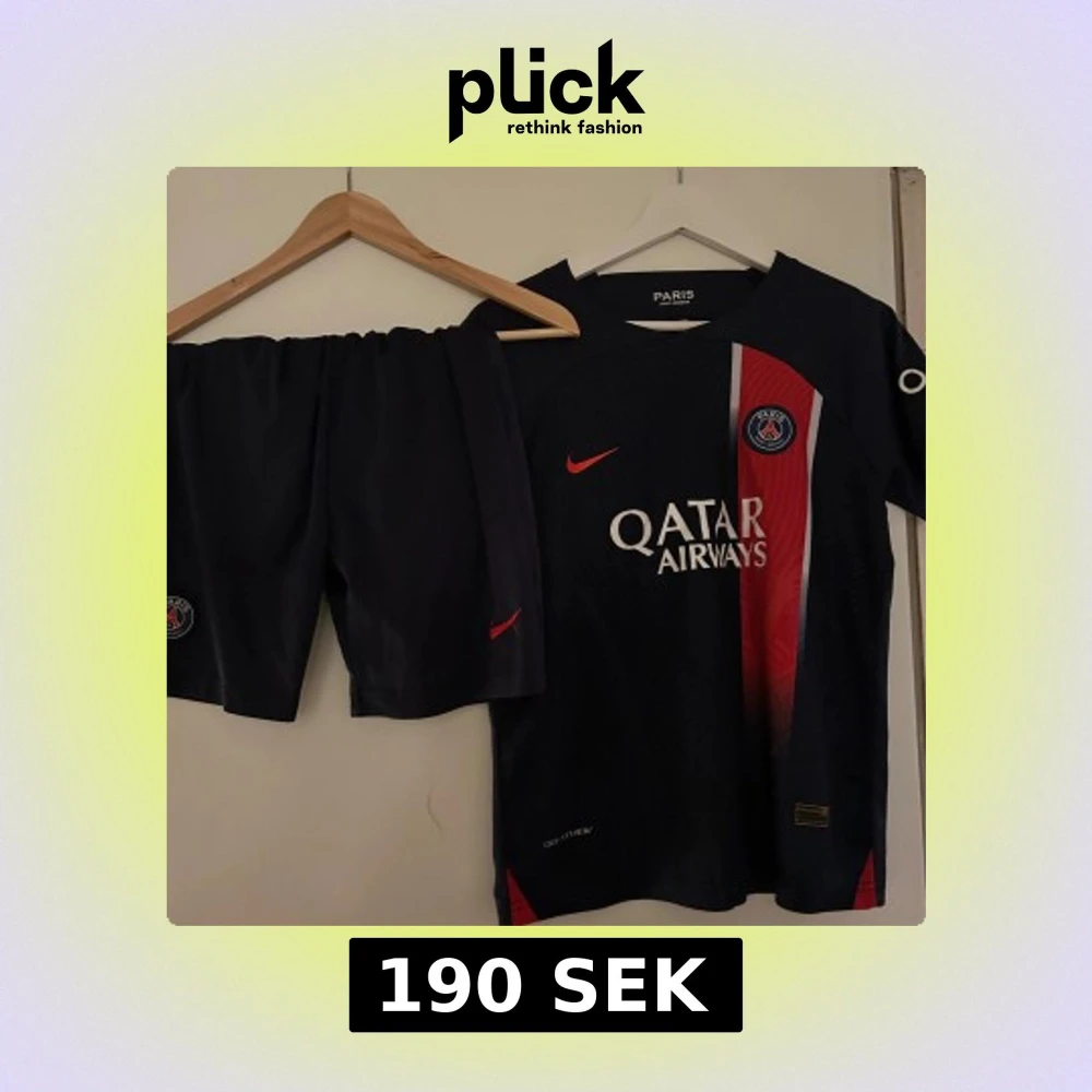 Säljer ett PSG matchställ från Nike med kortärmad tröja och shorts. Tröjan är marinblå med röd och vit rand längs framsidan, PSG-logga på bröstet och Qatar Airways tryck. Materialet är lätt och andas, perfekt för träning eller match.