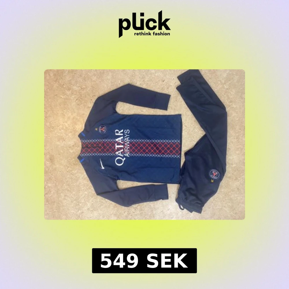 Paris Saint-Germain långärmad fotbollströja från Nike i mörkblått med röda och vita detaljer. Tröjan har tryckt Qatar Airways-logga och PSG-emblem på bröstet. Materialet är lätt och andas, perfekt för träning. Säljes tillsammans med matchande byxor med PSG-logga.