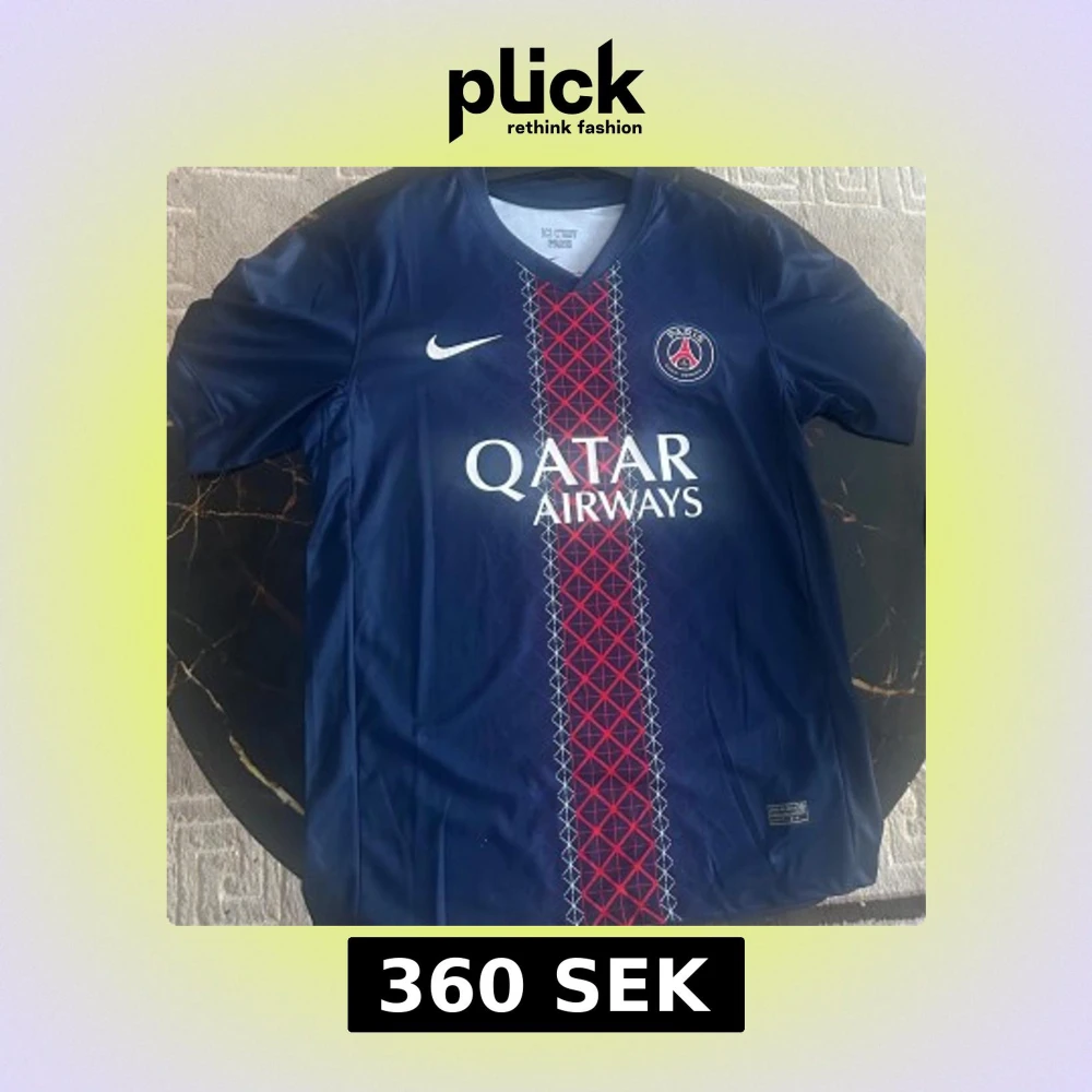 Paris Saint-Germain fotbollströja med D.Doué och nummer 14 på ryggen. Marinblå med röd och vit randigt geometriskt mönster i mitten, PSG-logga på bröstet och Nike Swoosh. Qatar Airways tryck på framsidan. Tillverkad i lätt polyester med korta ärmar och V-ringad hals.