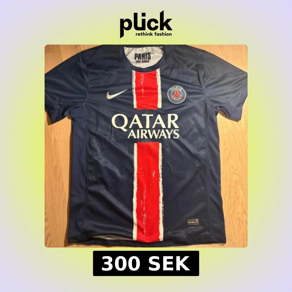 Paris Saint-Germain fotbollströja med D. Doué och nummer 14 på ryggen. Mörkblå med röd och vit rand på framsidan, PSG-emblem på bröstet och Qatar Airways-tryck. Tillverkad i lätt och ventilerande material, perfekt för match och träning