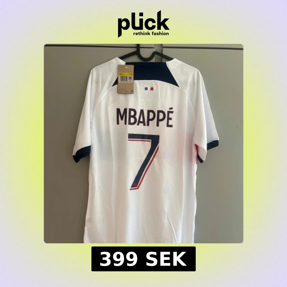 Snygg vit PSG fotbollströja med Mbappé 7 på ryggen. Tröjan har korta ärmar, mörkblå och röda detaljer samt Paris Saint-Germain-logga och Nike-märke framtill. Tillverkad i lätt och ventilerande material, perfekt för fotbollsplanen eller att bära till vardags.