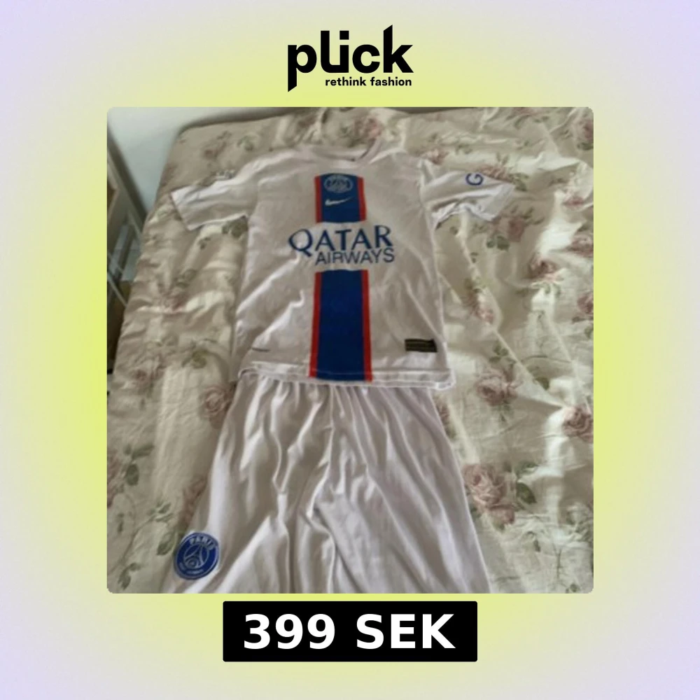 Paris Saint-Germain fotbollströja med Mbappé och nummer 7 på ryggen. Vit med blå och röda ränder framtill, PSG-logga och Qatar Airways tryck. Kortärmad, tillverkad i Dri-FIT material som andas. Snygg design med klassiska PSG-detaljer och Nike-logga.