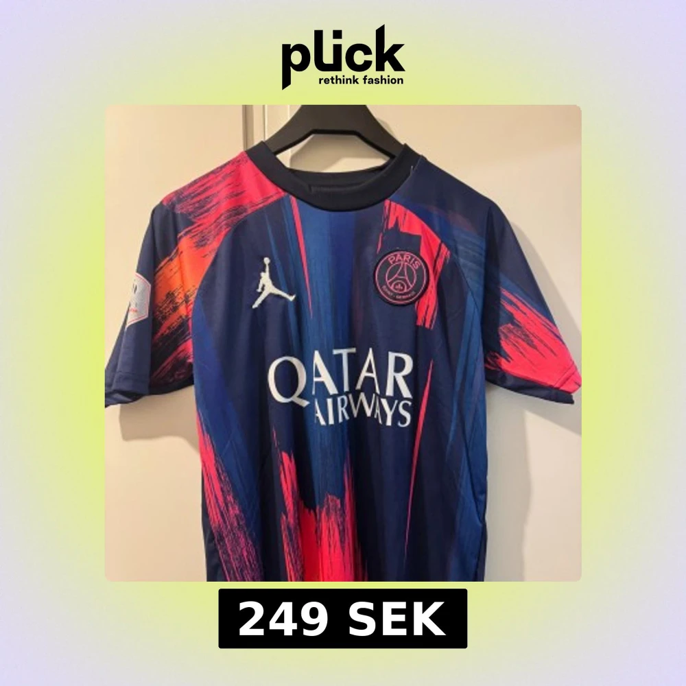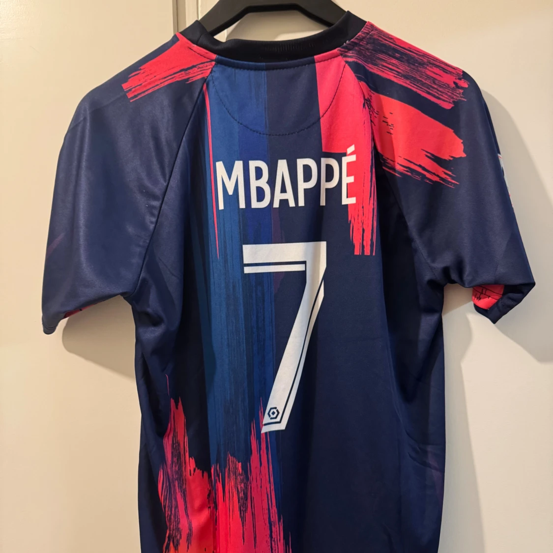Snygg PSG fotbollströja med Mbappé 7 på ryggen, designad i samarbete med Jordan. Tröjan har ett unikt blått och rött mönster med vita detaljer och klubbmärke på bröstet. Tillverkad i lätt och ventilerande material, perfekt för match eller träning.