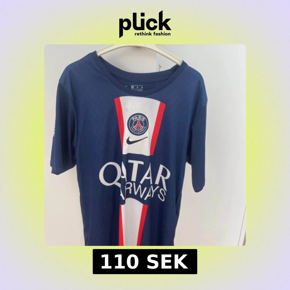 Paris Saint-Germain fotbollströja med Messi #30 på ryggen. Djup marinblå färg med vit och röd vertikal panel framtill, PSG-logga och Nike swoosh. Kortärmad, tillverkad i lätt polyester som andas. Snyggt tryck med Qatar Airways på bröstet och detaljer på ärmarna.